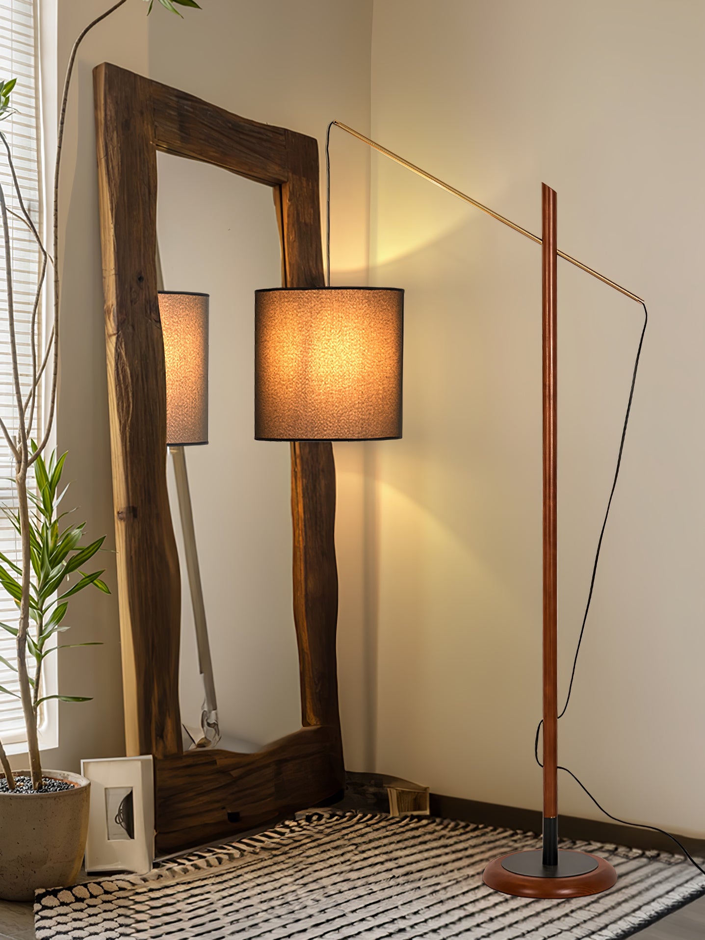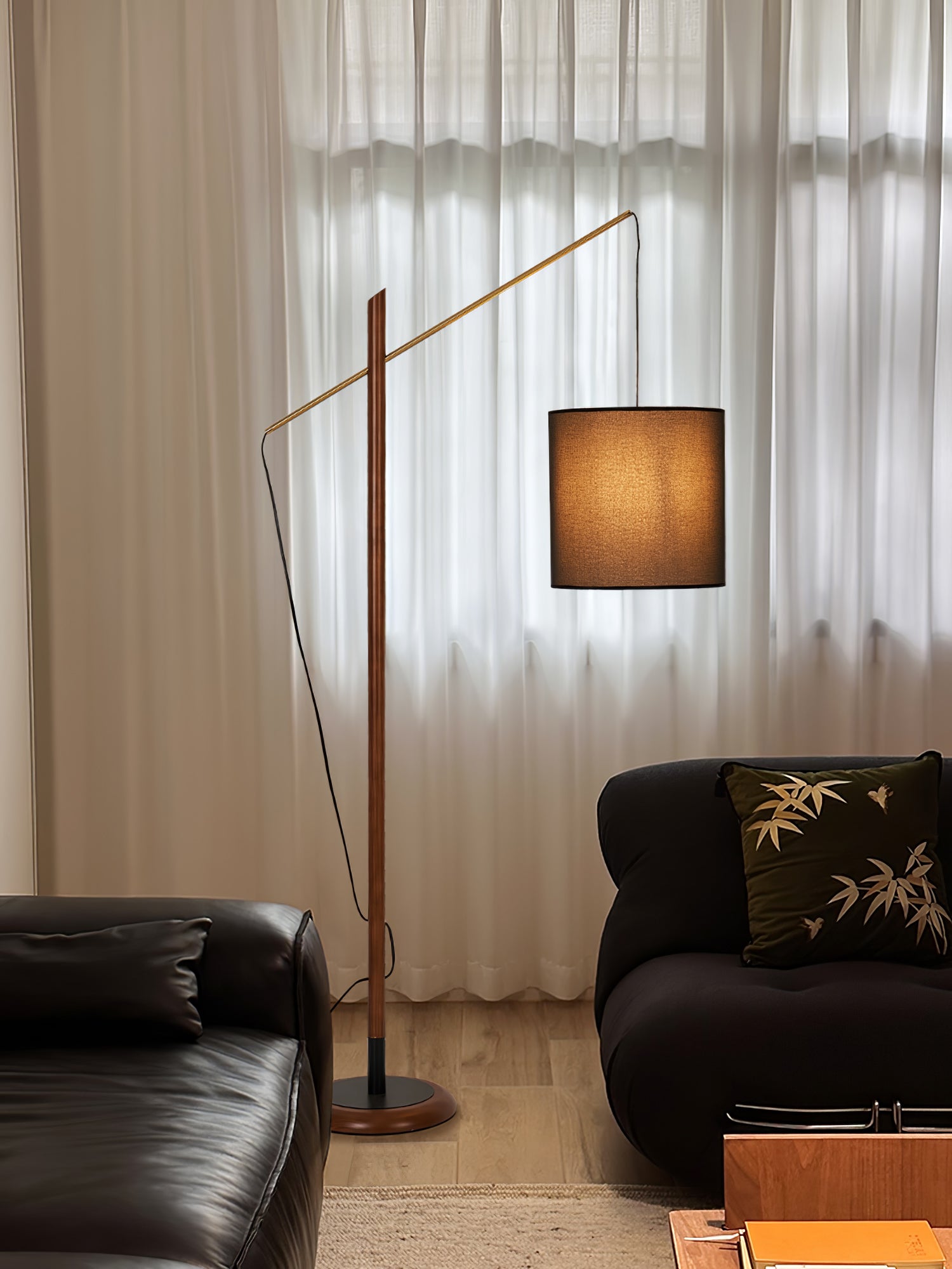 Introduce the Archer Floor Lamp to your space. This modern lamp features a sleek black metal base, walnut neck, and fabric shade for a stylish touch. Adjust the light to the perfect angle, illuminating any area with precision. Enhance your living space with this functional and chic floor lamp.