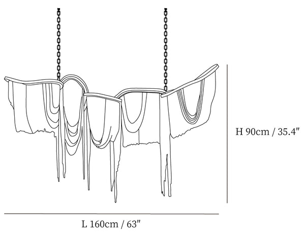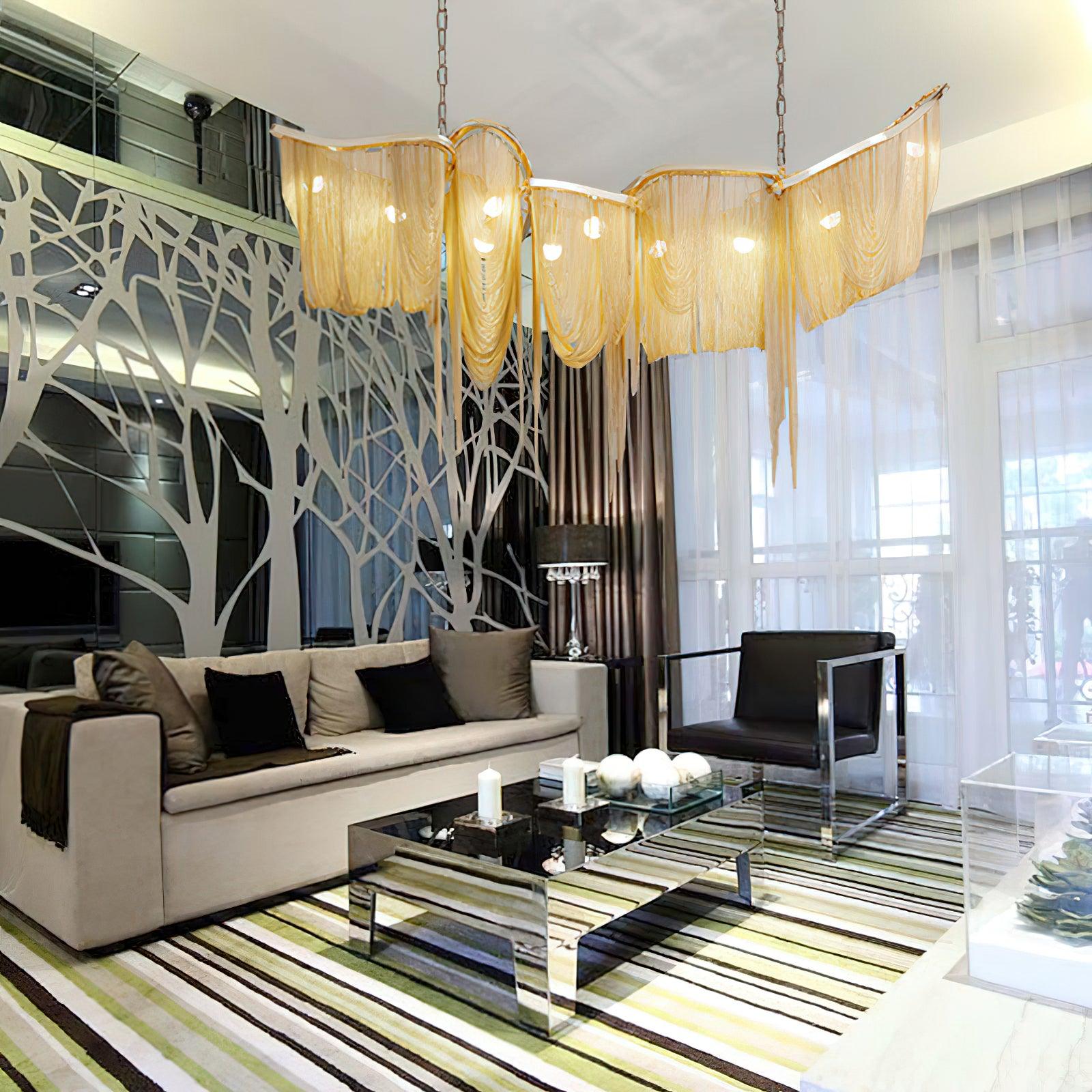 Elevate your space with the Ark Tassel Chandelier. This postmodern rectangular dining room chandelier boasts a durable iron and aluminum construction, with a high-quality tassel chain that is anti-oxidation treated for long-lasting beauty. Make a statement with this creative designer piece in your living room, bar, or dining area.