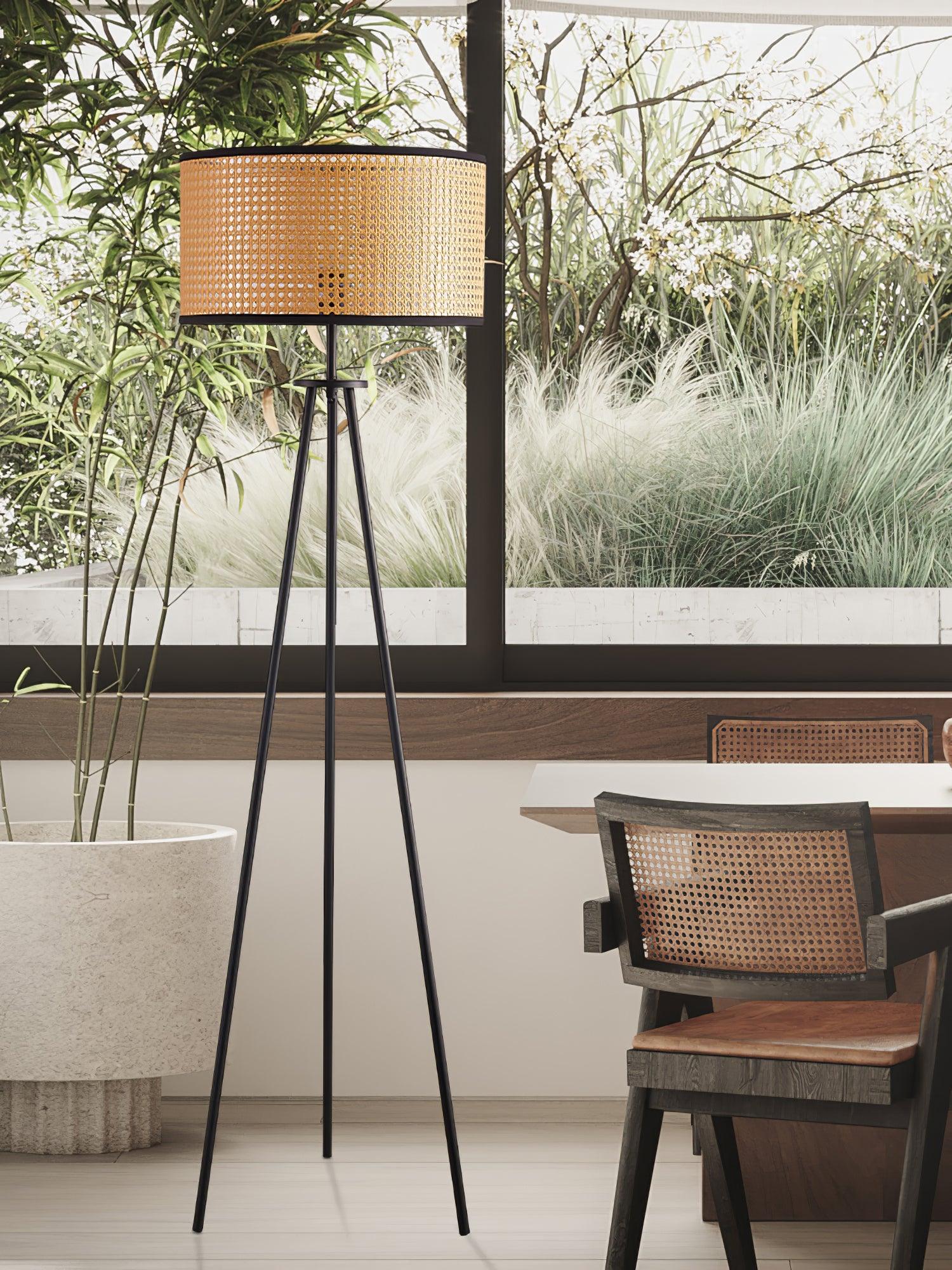 The Aubrey Floor Lamp is expertly designed with a natural color bamboo shade and black edge detailing. It includes three sturdy black-finished metal legs for a modern yet timeless look. Enjoy bright, warm lighting in any room.