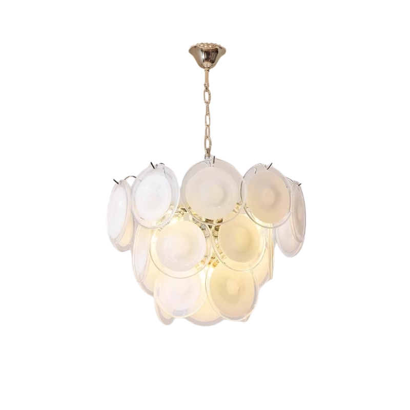The Bettina Murano Chandelier is a luxurious lighting piece to bring a touch of sophistication to any room. The white, softly glowing glass discs create a warm and inviting ambiance. An ideal choice for elegant home decor.