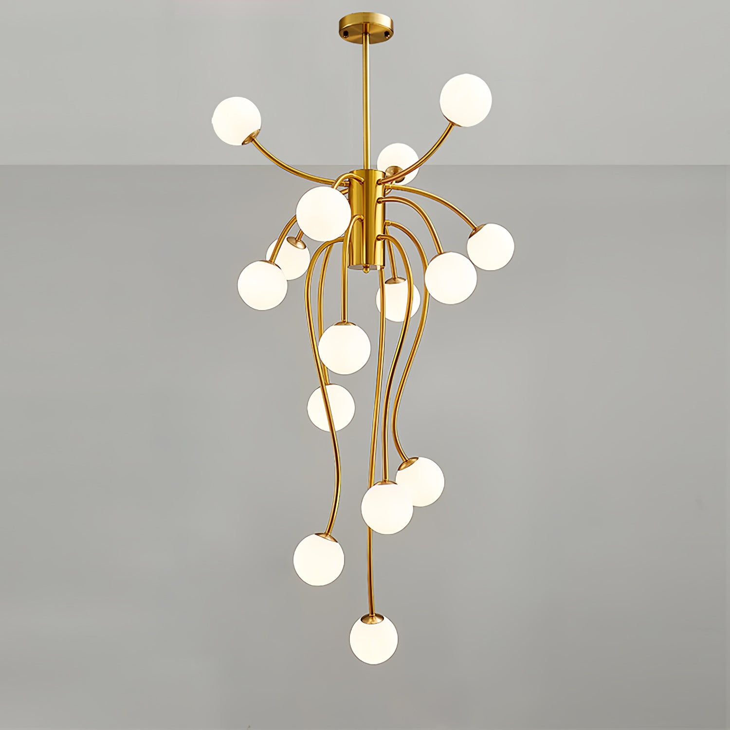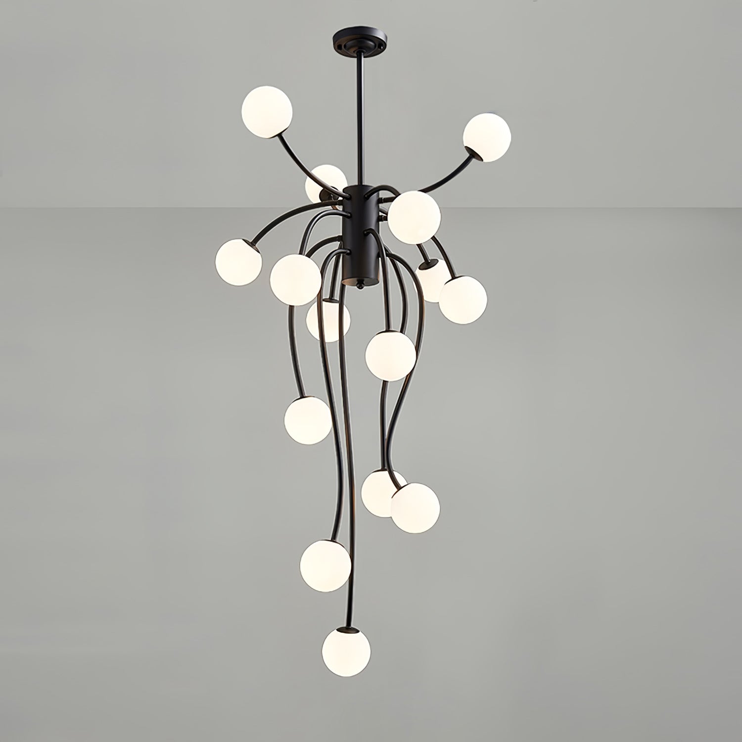 The Caroline Chandelier features custom-designed materials and unique angled edges, creating a striking contrast on each piece. Elevate your space with this sleek and modern design.