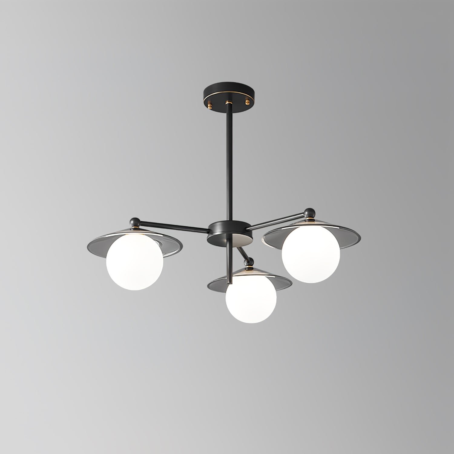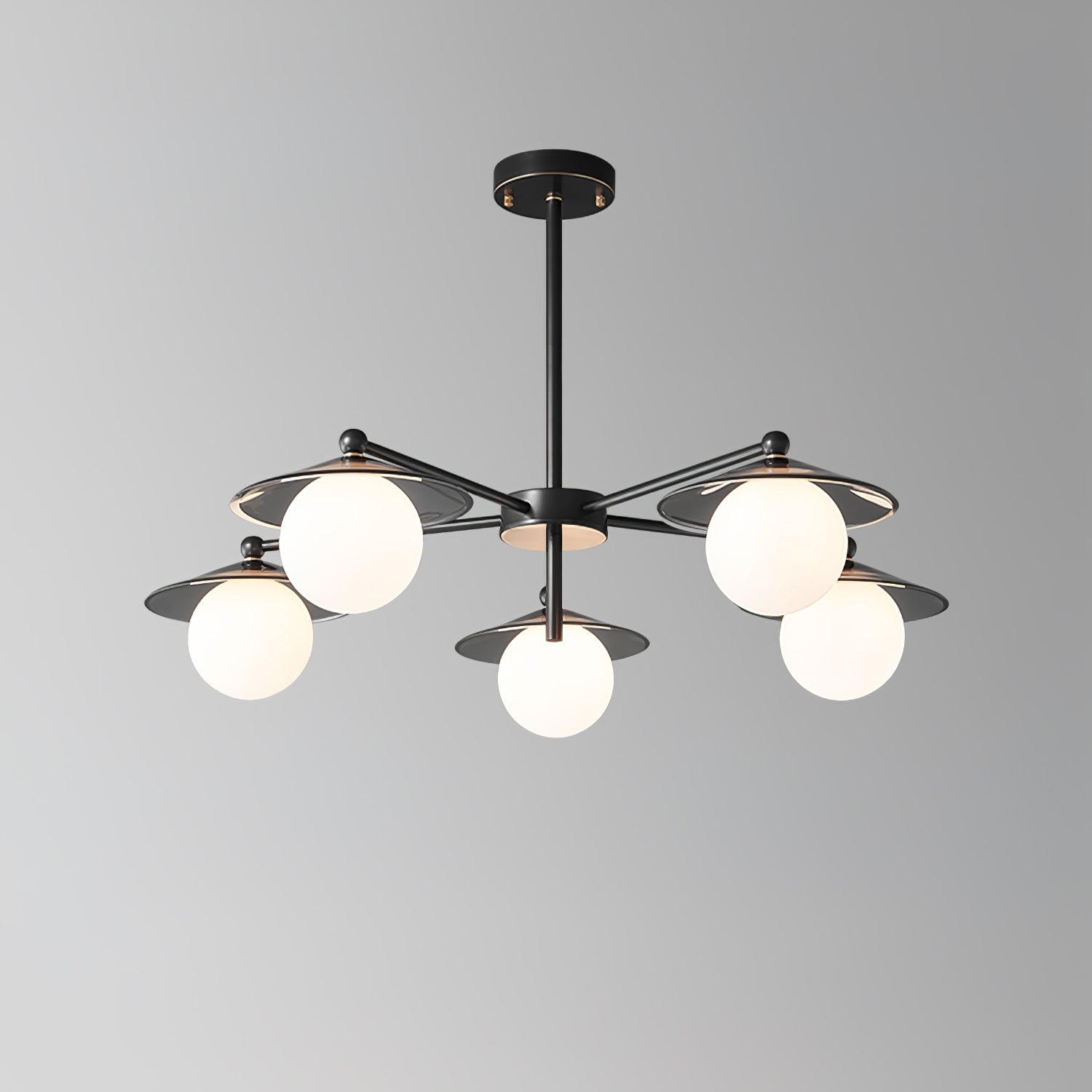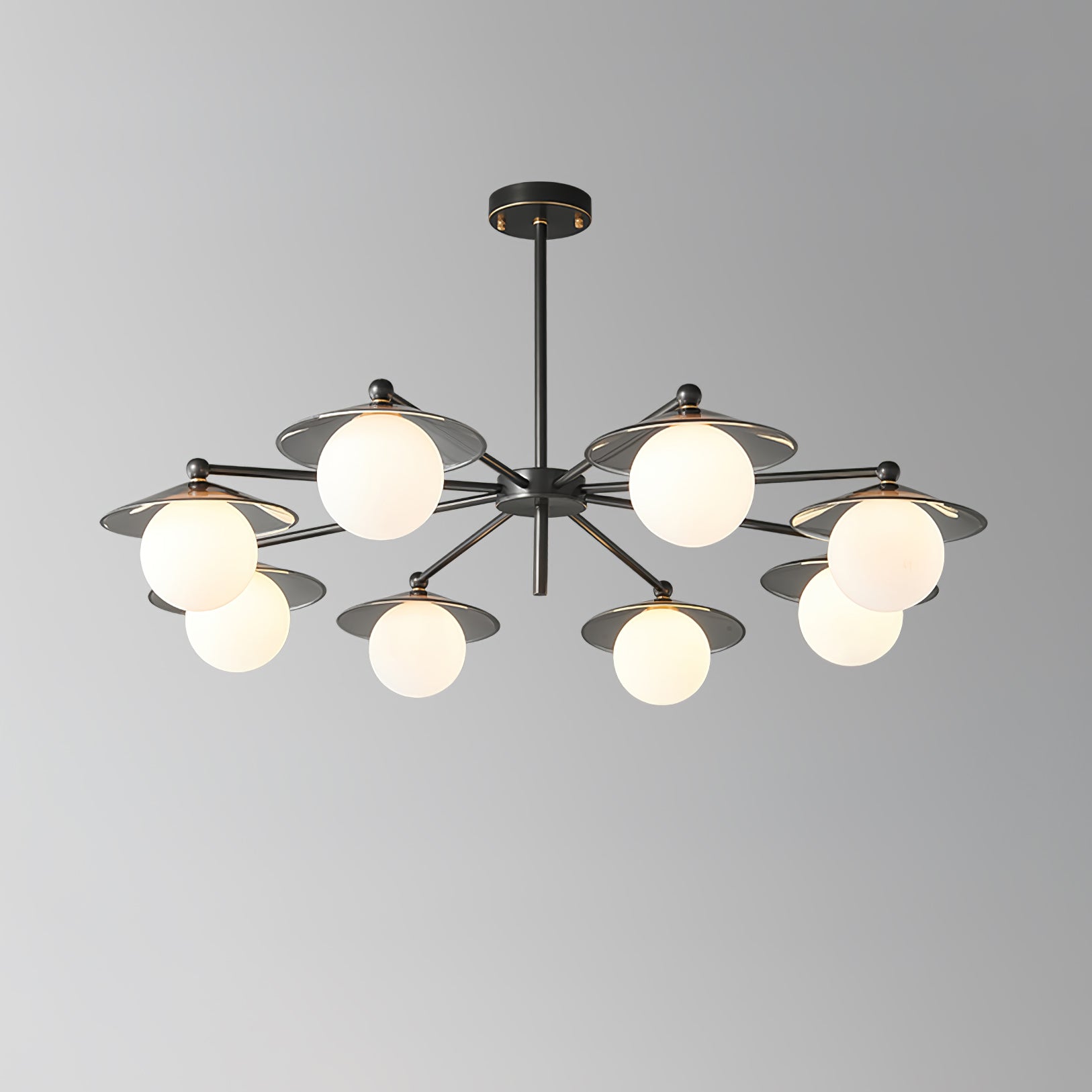 The Celestial Saucer Chandelier presents a captivating interplay of glass and metal, embodying the mystique of a futuristic odyssey. Each orb of glass delicately balances on metallic discs reminiscent of unidentified flying objects gliding through the cosmos. The ensemble of saucer elements forms a harmonious constellation that radiates soft, diffused light, akin to the gentle illumination of a star cluster. This chandelier is not just a source of light; it's a statement piece that encapsulates the spirit of space exploration and the elegance of modern design. Perfect for those looking to infuse their space with a touch of the extraterrestrial, the Celestial Saucer is a true conversation starter that combines functional lighting with avant-garde aesthetics.