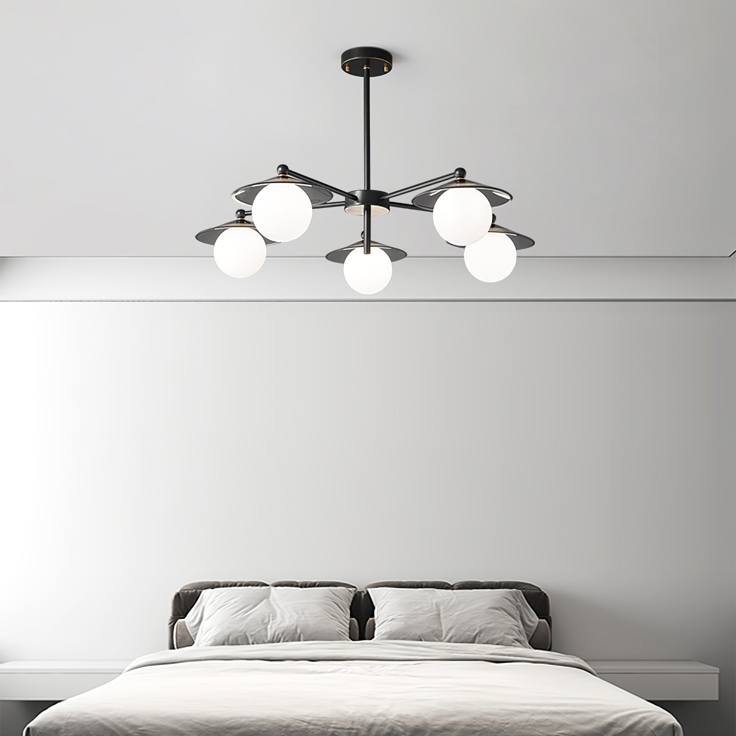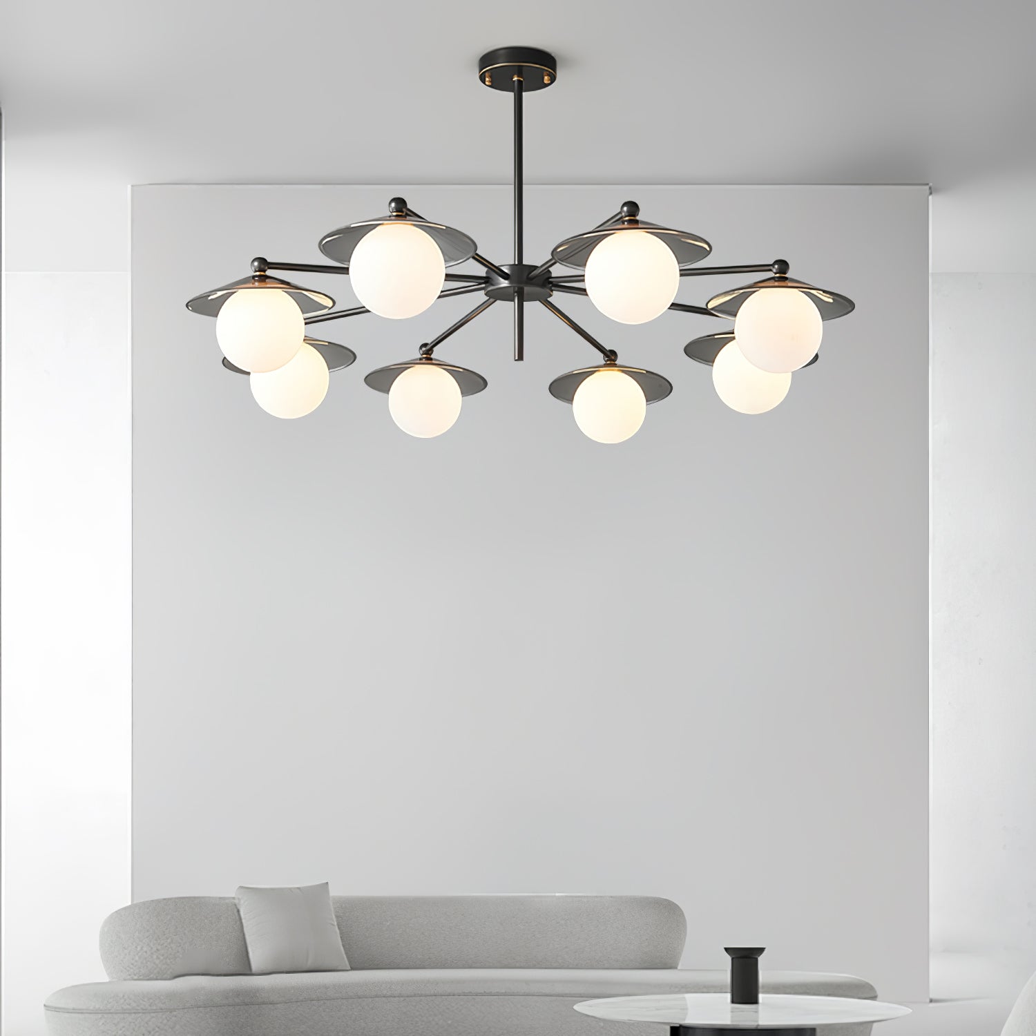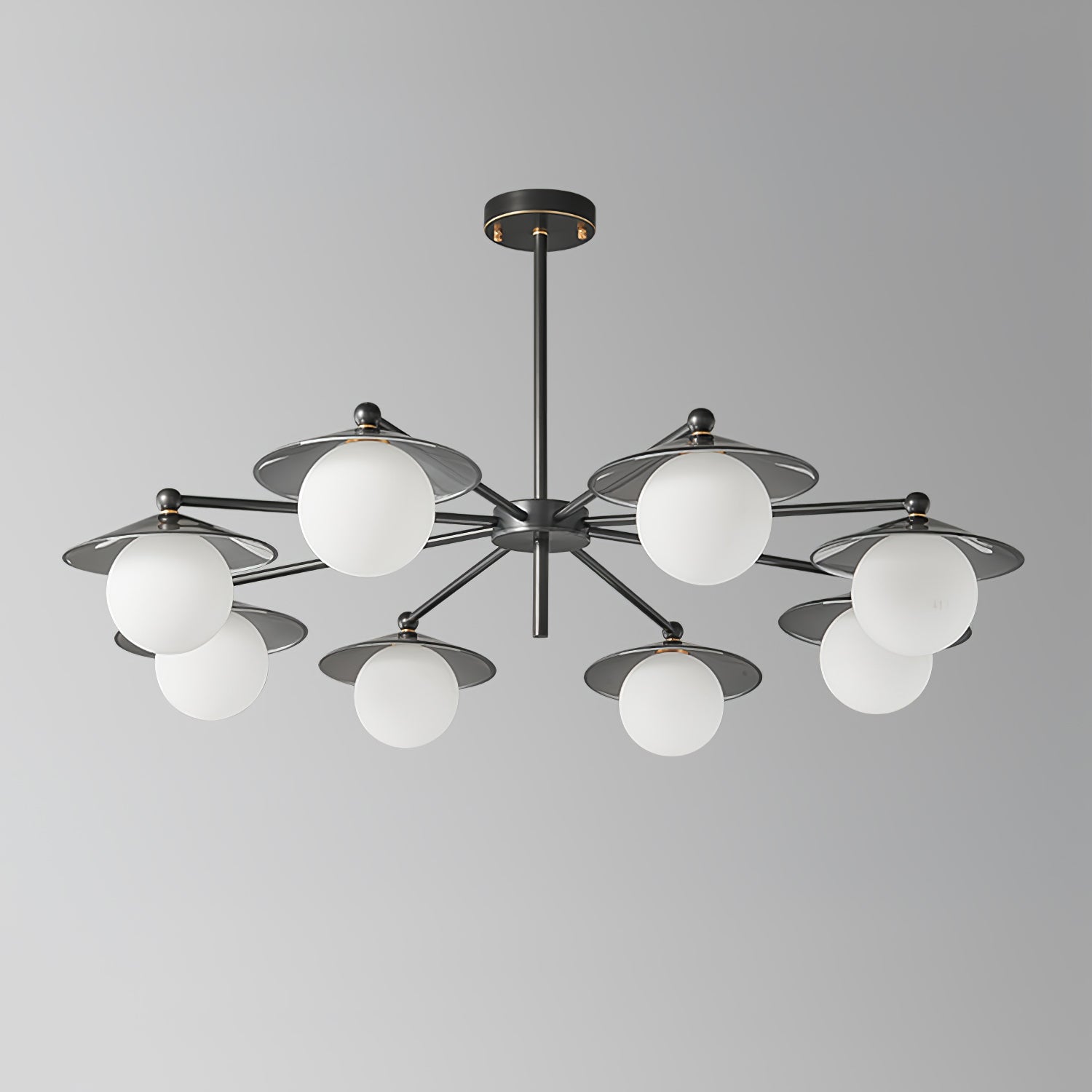 The Celestial Saucer Chandelier presents a captivating interplay of glass and metal, embodying the mystique of a futuristic odyssey. Each orb of glass delicately balances on metallic discs reminiscent of unidentified flying objects gliding through the cosmos. The ensemble of saucer elements forms a harmonious constellation that radiates soft, diffused light, akin to the gentle illumination of a star cluster. This chandelier is not just a source of light; it's a statement piece that encapsulates the spirit of space exploration and the elegance of modern design. Perfect for those looking to infuse their space with a touch of the extraterrestrial, the Celestial Saucer is a true conversation starter that combines functional lighting with avant-garde aesthetics.