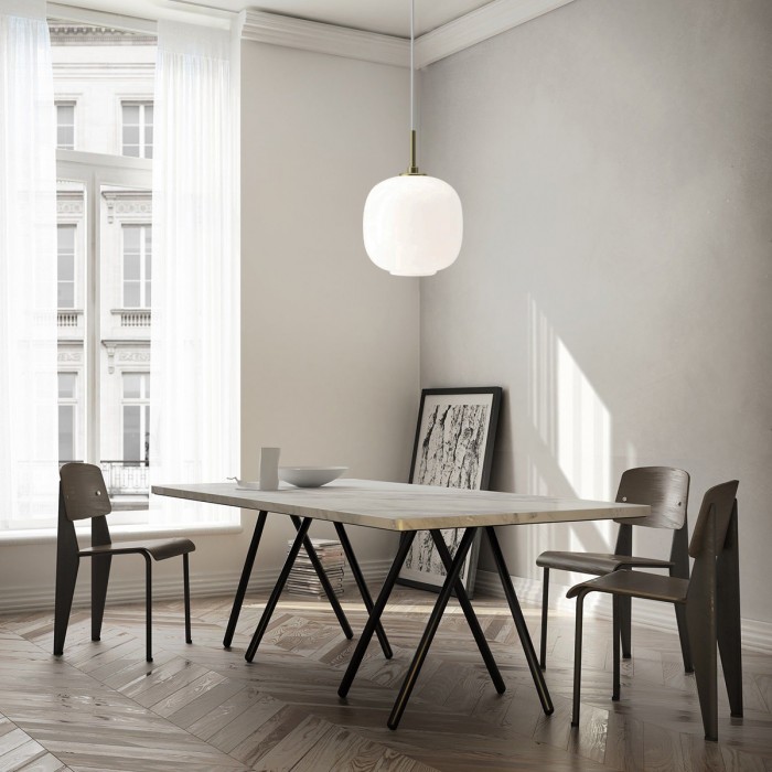 This VL45 Classic Orb Pendant Lamp features gold and white tones, giving it an elegant and opulent feel. The elegant glass ball design lamp has clean lines and a smooth surface that can be easily integrated into any room design.