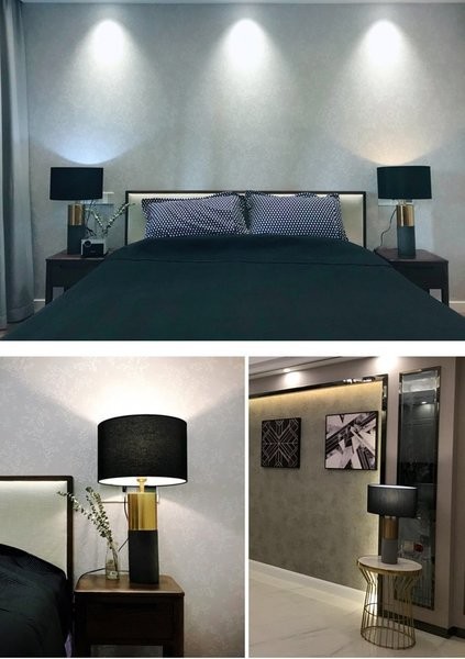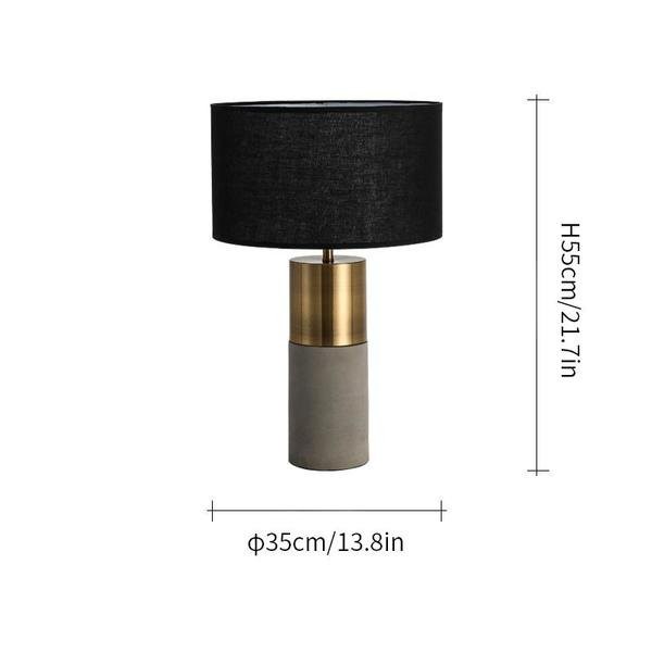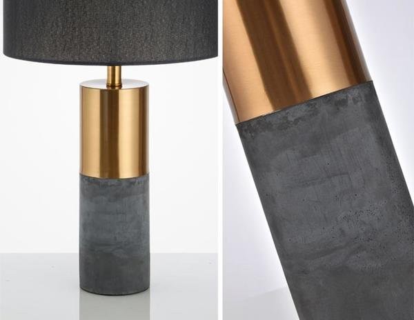 Define your space with the decadence of this modern cylinder table lamp. The steel and concrete base flaunts a gold metal finish for a luxurious look. A dramatic black fabric drum-shaped shade complements the base. The 59-inch clear cord provides plenty of length to place the lamp in your living room or bedroom for extra light, while a switch located on the socket allows you to easily turn the light on and off. One spiral CFL light bulb is included. This LED desk lamp has energy-saving, low power consumption, no flickering lighting, so your eyes will not fatigue.Modern design naturally fits your desk/room/furniture; is the coolest bedside lamp you ever hadThis charming table lamp is ideal for many decorations, especially the nightstand or headboard.