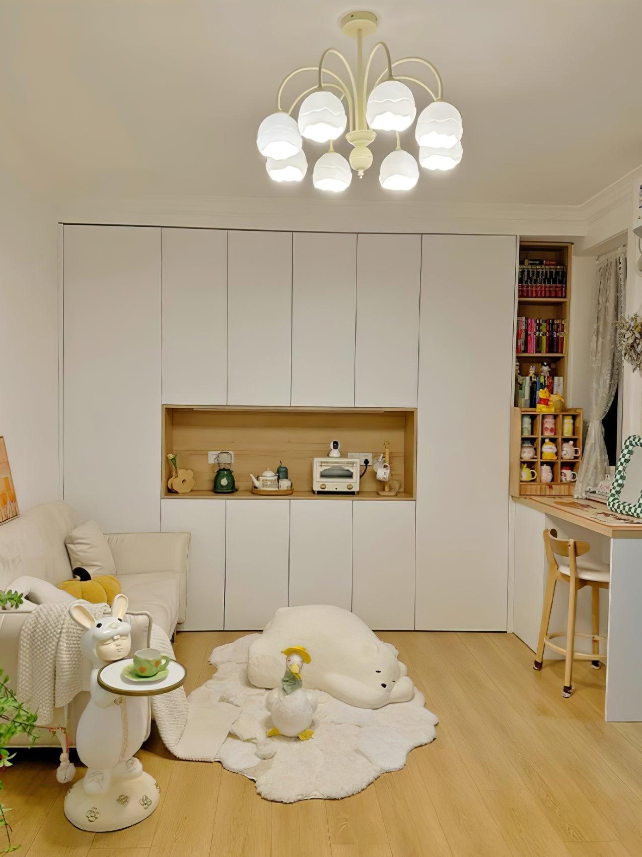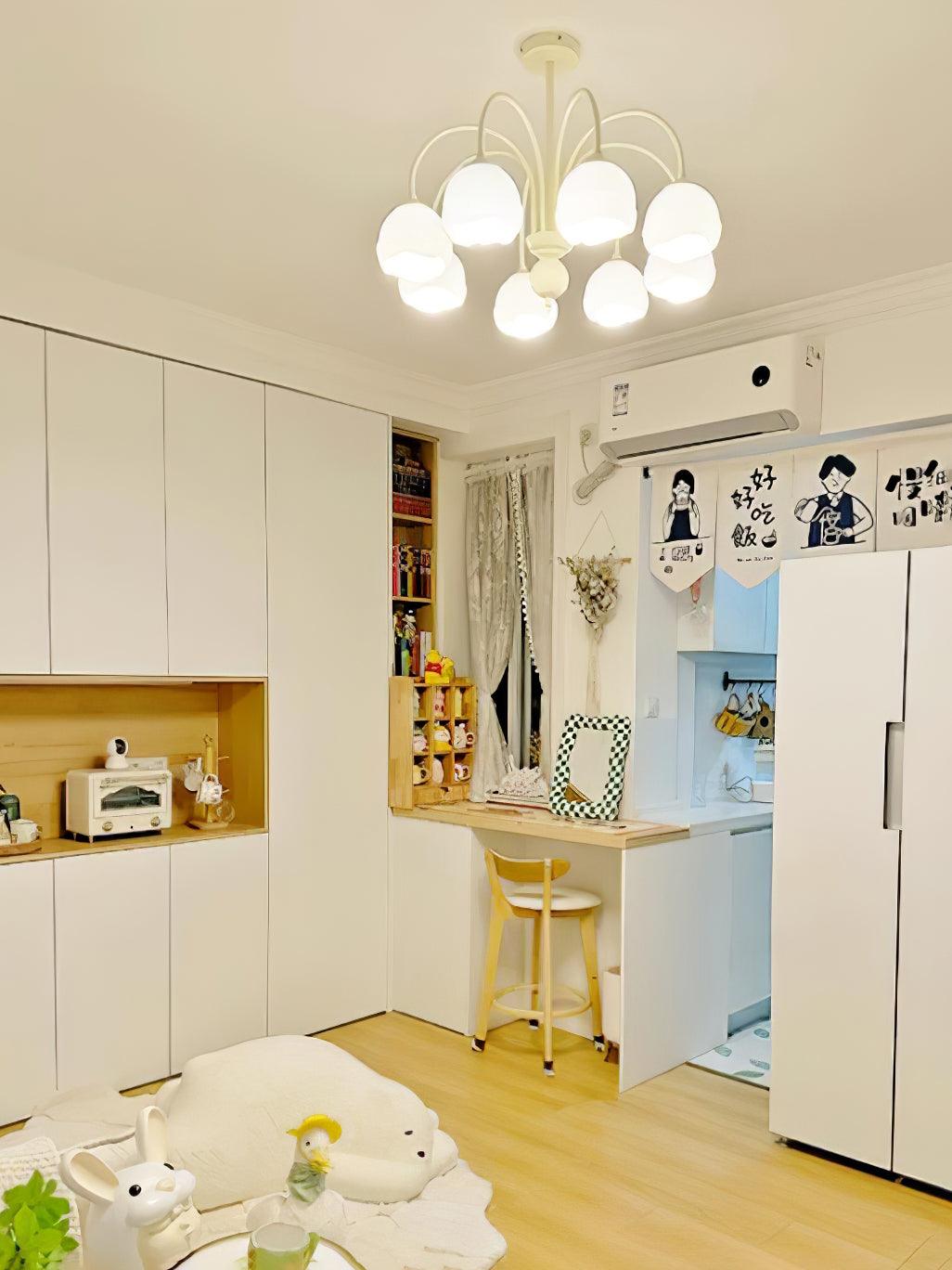 The Creamy Chandelier is a modern and stylish addition to any room. Featuring a glass shade in a cream and white fused style, it is sure to make a statement. Enjoy the gentle glow of the ins fashion-inspired light, offering a contemporary touch to your living space.