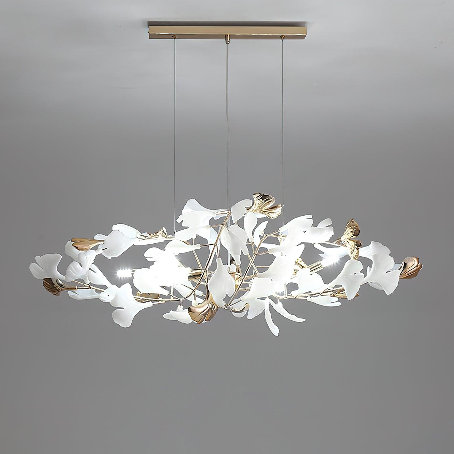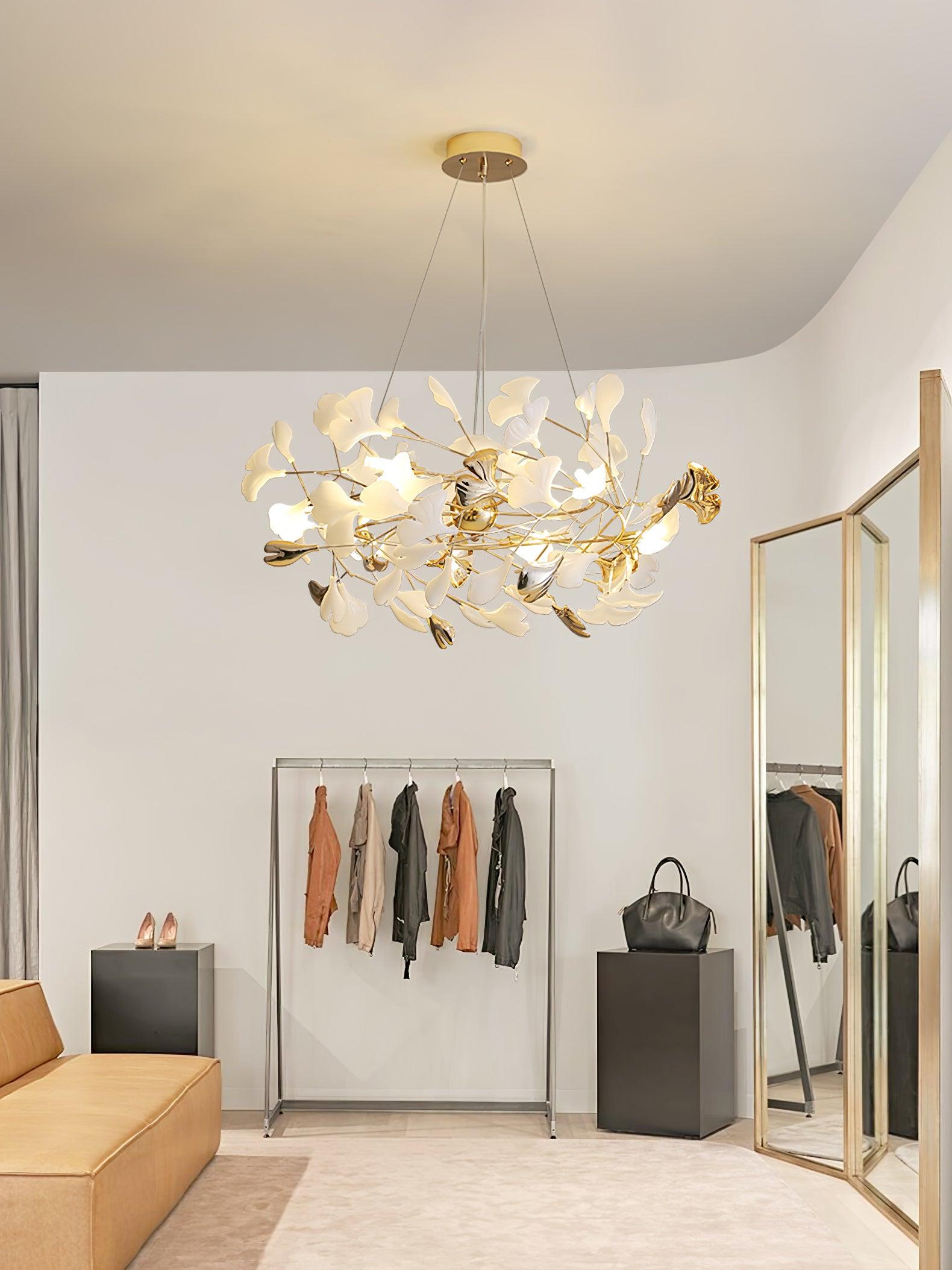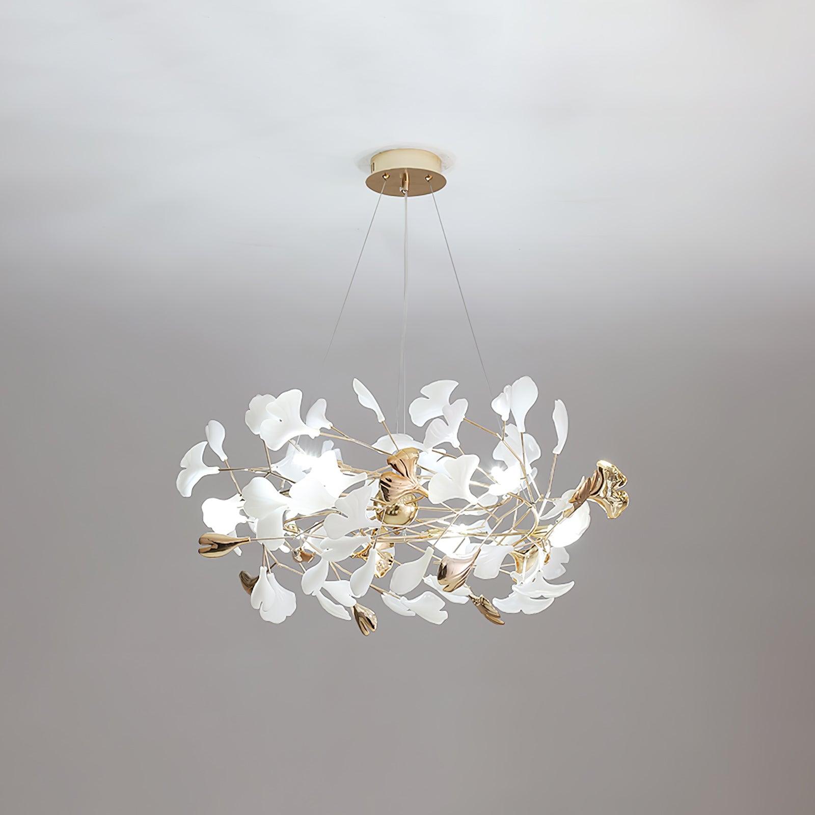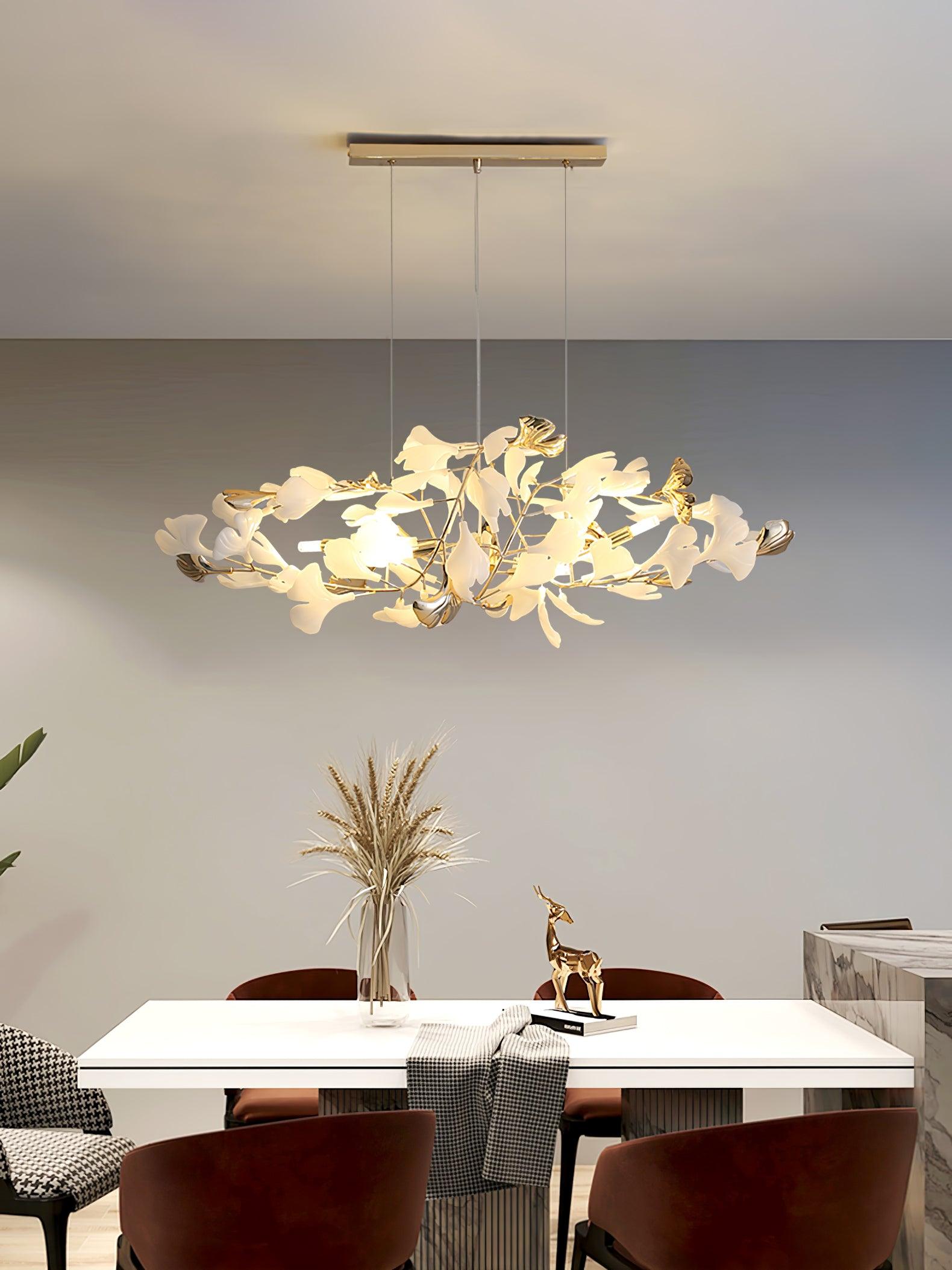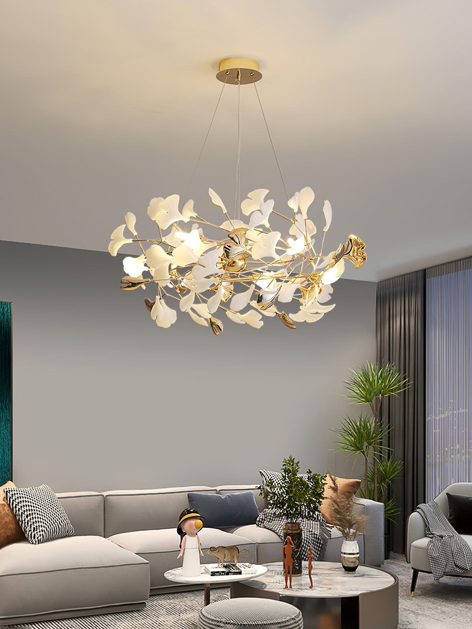 This ginkgo leaf chandelier is made of iron and decorated with delicate ginkgo leaves made of ceramic. The overall design cleverly combines natural elements and modern craftsmanship, giving it a natural charm without losing a sense of modernity. The iron bracket ensures the stability and durability of the chandelier, while the ceramic ginkgo leaves show a unique luster under the light, bringing a warm and elegant atmosphere to the indoor space. This chandelier perfectly illustrates the harmony between craftsmanship and nature, making it ideal for every home space.