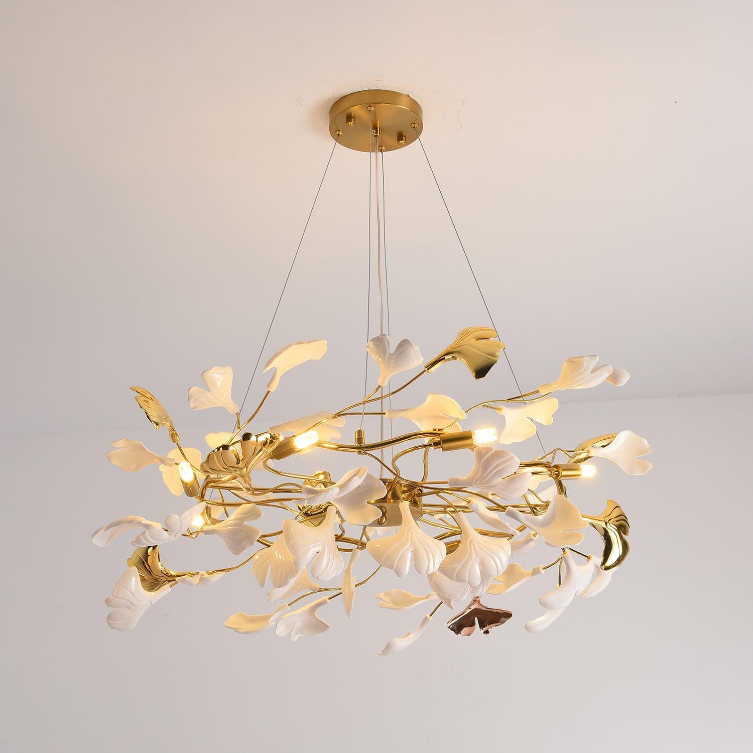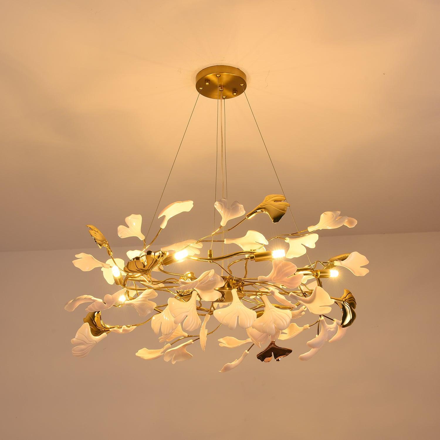 Crafted from metal, iron and ceramic materials, this elegant Ginkgo Leaf Chandelier showcases exquisite craftsmanship and design aesthetics. The main structure of the chandelier is made of strong and durable metal material, ensuring the stability and durability of the suspension. The iron arms are finely polished and coated with gold, which adds to the overall texture and gloss. The ceramic ginkgo leaves, with their natural white tone and delicate texture, are like young leaves blown by the spring breeze, adding a touch of softness and vitality. The smooth surface of the white ceramic pieces reflects a warm glow under the light, creating a relaxed and harmonious atmosphere. Whether in a modern home or a traditional décor, this chandelier adds depth and visual focus to a space, making it ideal for any room.