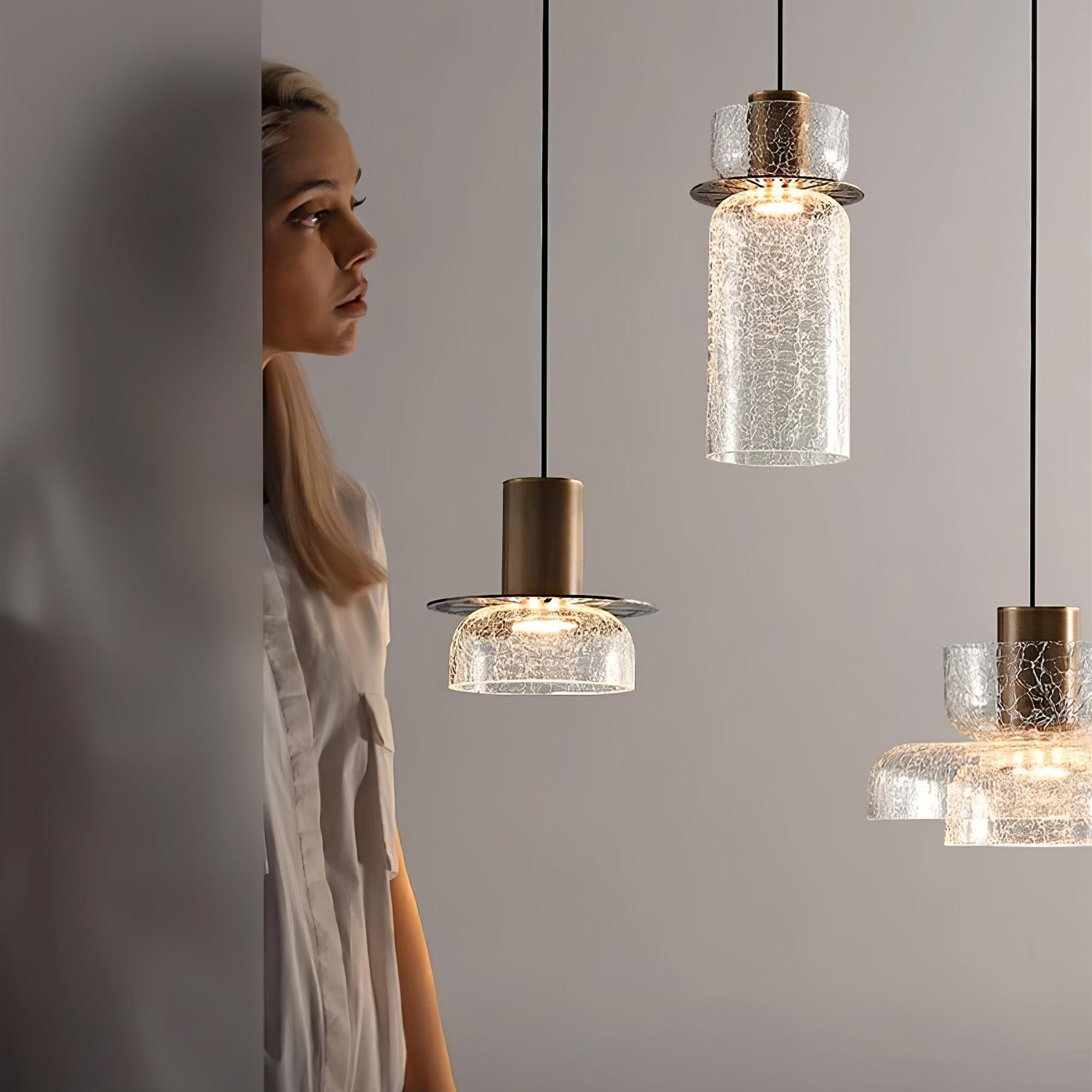 The "Glacier Crackle Glass Pendant" is an exquisitely crafted lighting fixture that brings the awe-inspiring beauty of icy landscapes into your home. Crafted with iron for lasting durability and featuring a stunning glass shade with a unique crackled texture, this pendant light captures the essence of frost patterns on a winter window. Its double-layer design, with one glass shade suspended above another, creates a dynamic play of light that mimics the shimmering quality of sunlight on snow. When illuminated, it casts a radiant glow that is both warm and invigorating, while the intricate crackle detail of the glass diffuses the light, producing a gentle and ambient atmosphere. Perfect for creating a statement in your living room, dining area, or above a kitchen island, this pendant is not only a source of light but a piece of art that reflects the raw beauty of nature's frostwork.