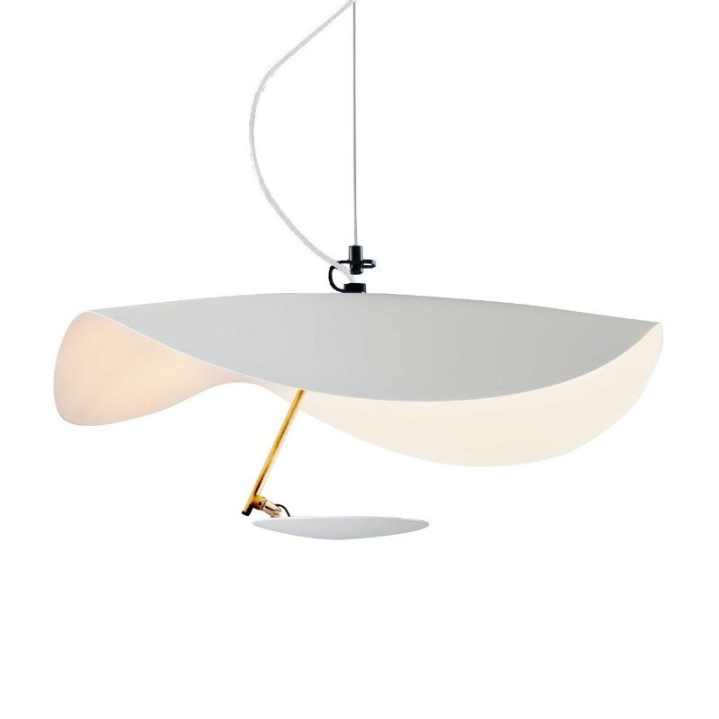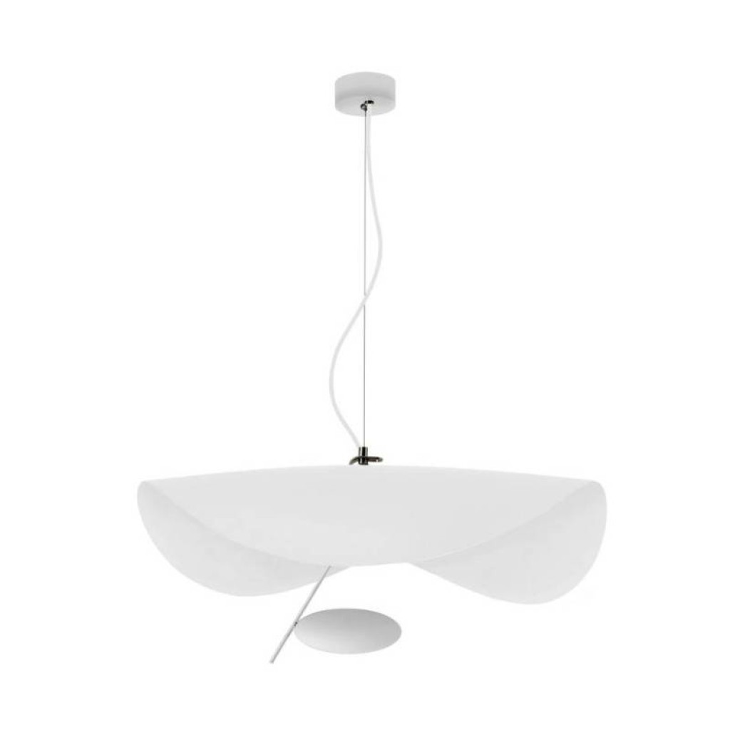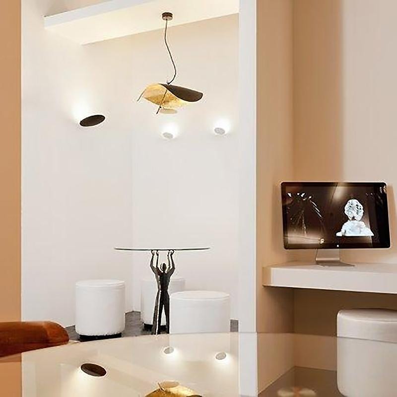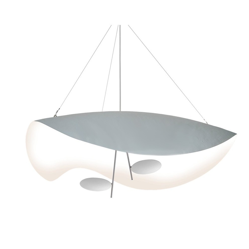 The Lederam Manta Pendant/ Ceiling features a gracefully curving shade that embodies fluidity and the accuracy of the motion required to draw a line, with a disc shade extending out with a metal rod. Finished in White with the option of a White, Satin, or Gold rod. May be ceiling or wall mounted. CE listed. Born in 1950, Enzo Catellani lives in Bergamo. During the 1980s, he began the limited-series production of lamps made to his designs, for sale through his own shop. In 1989, the lamps attracted the attention of Düsseldorf-based distributors Renate and Peter Meese, who presented them at the Ambiente expo in Frankfurt, where they were rapturously received.