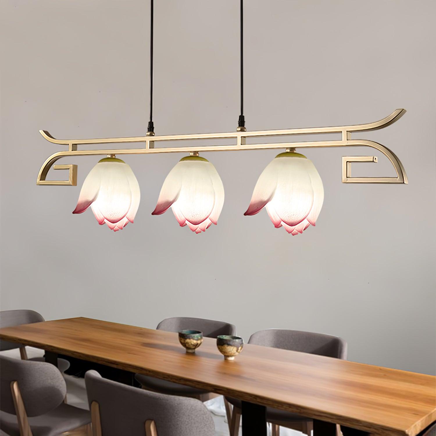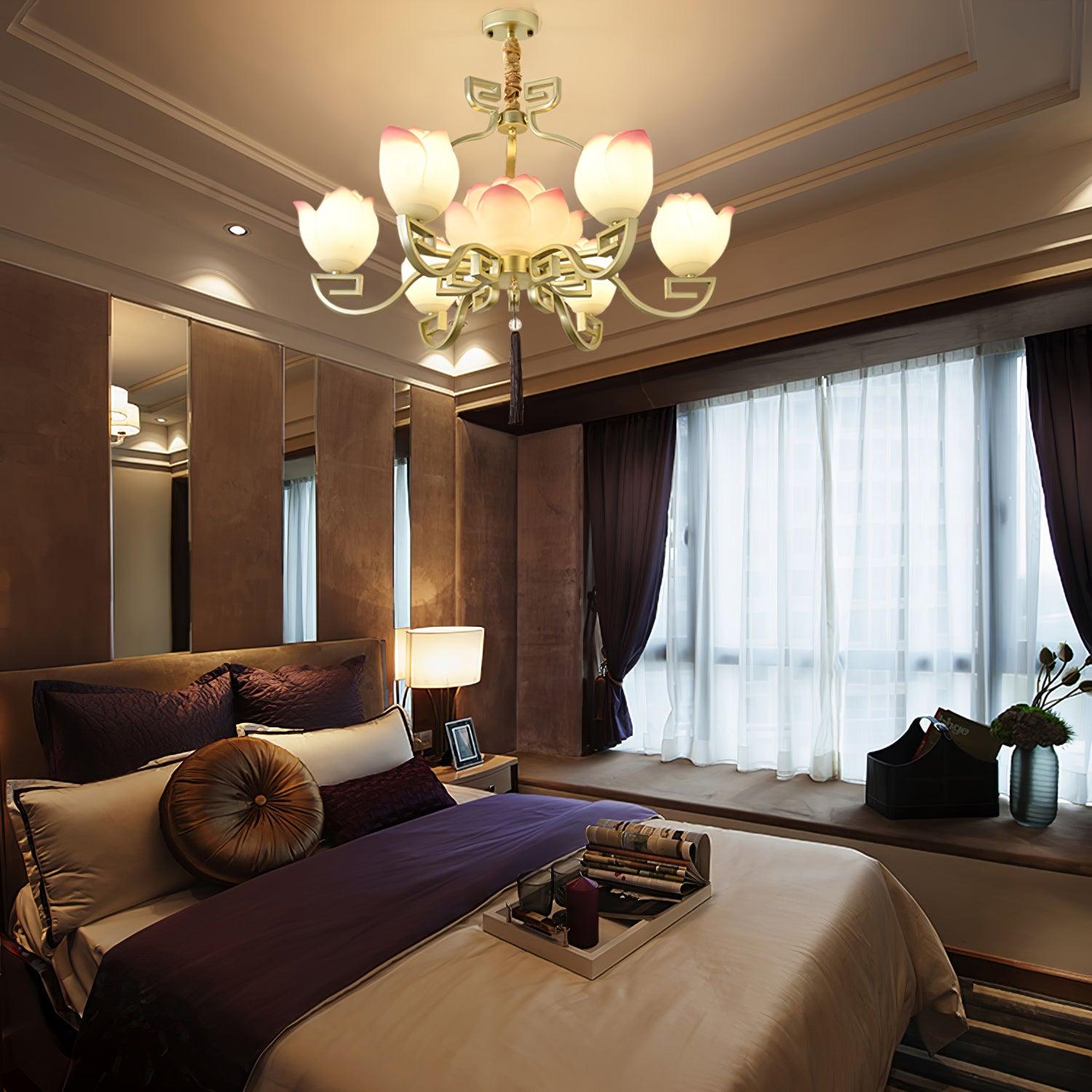 The Lotus Bloom Chandelier adds a touch of spring to any space. Its pristine white and pink resin lampshade exudes a calming aura, while its matcha style brings a fresh, modern look. Create a tranquil atmosphere with this beautiful light fixture.