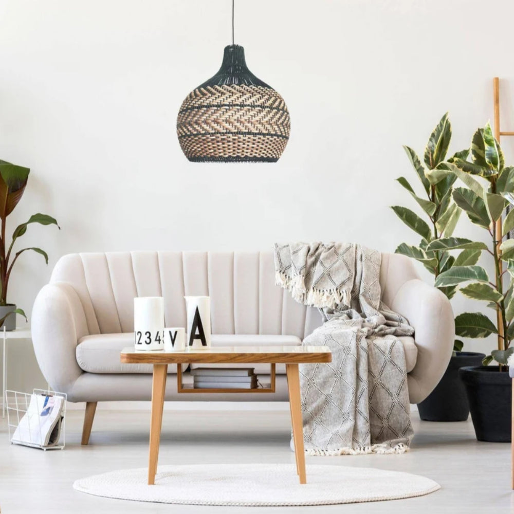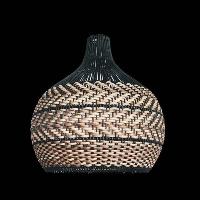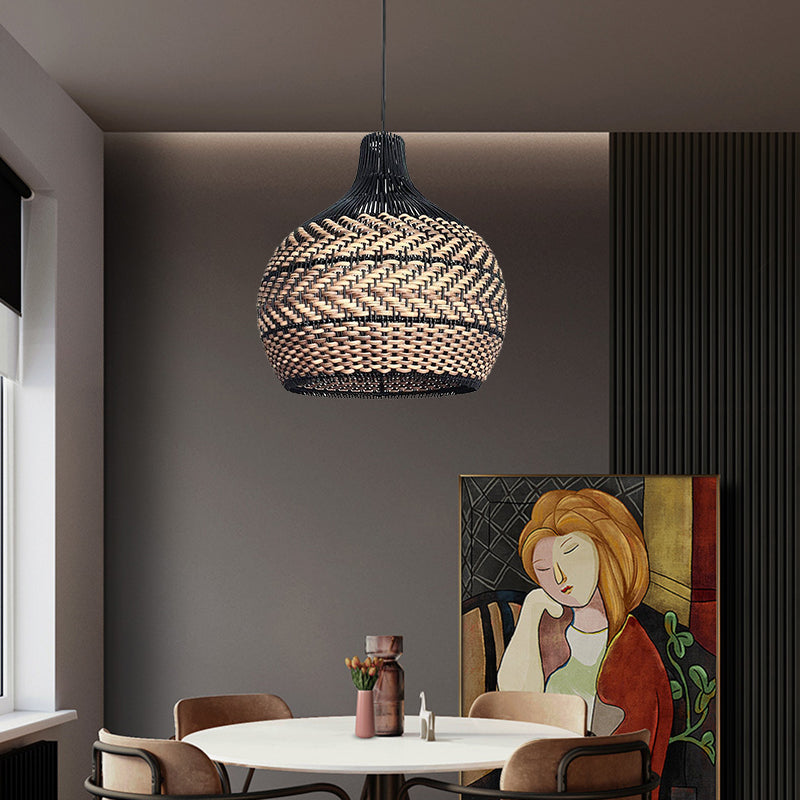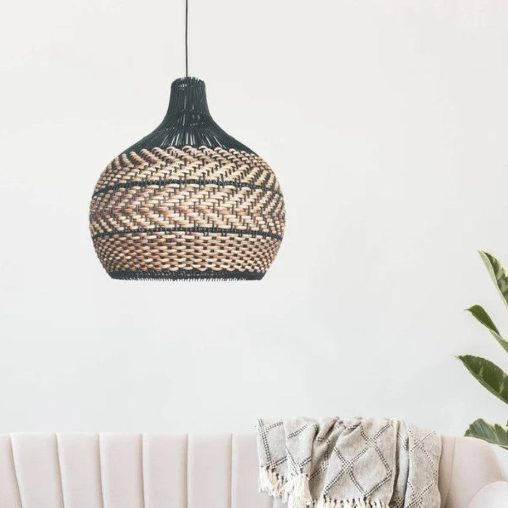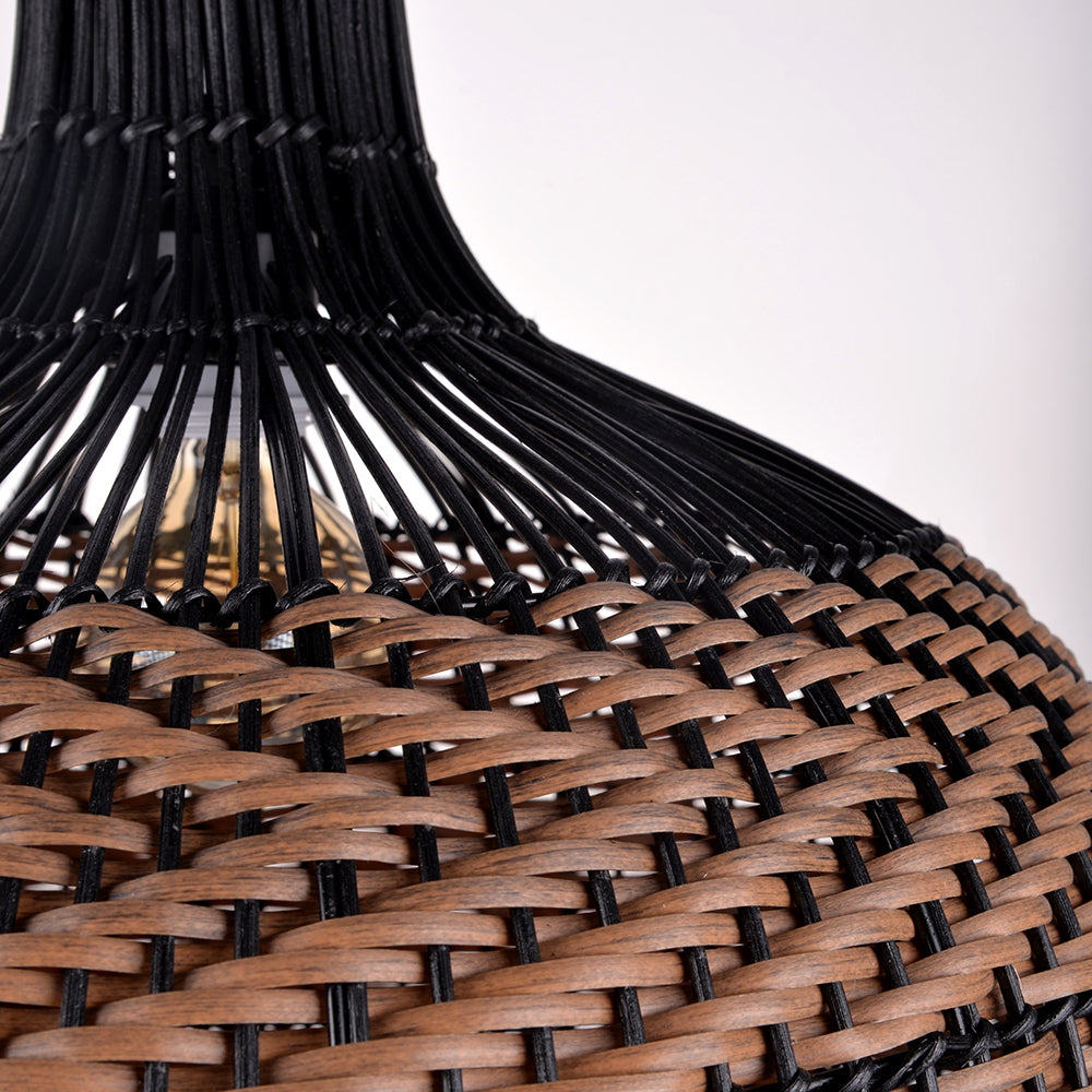 Herringbone weave of black and natural rattan poly wicker bamboo cast a warm glow as light seeps through the woven rattan of our woven pendant light.