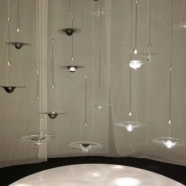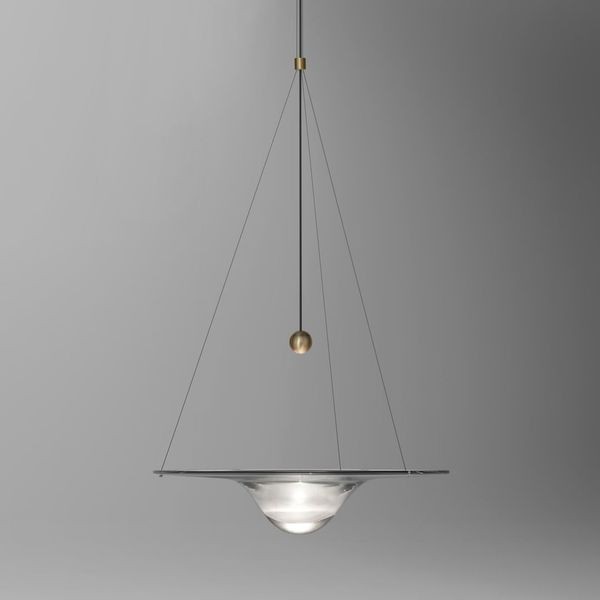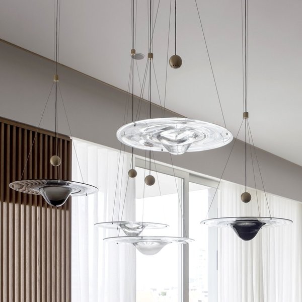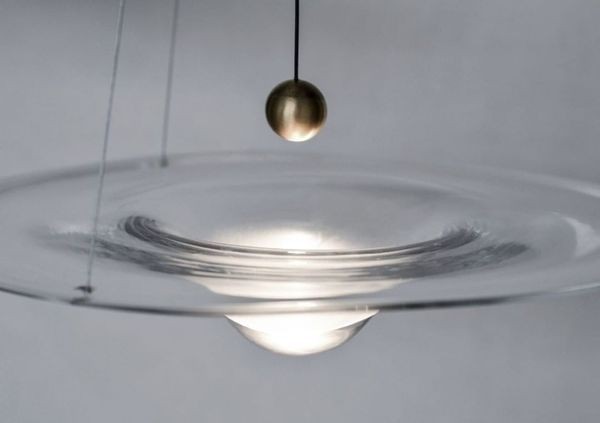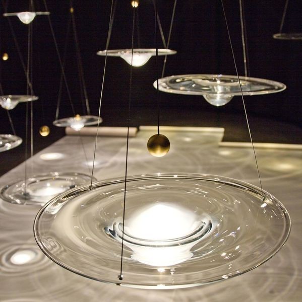 There is a moment when a clinging bead of water, in quiet orb-like suspension, becomes a droplet. The droplet reflects its surroundings while gathering light within. There is a moment when molten glass transforms from liquid to solid. This instant of transition is accompanied by an emission of beautiful light. Momento freezes that moment of ephemeral beauty and turns it into a source of light. The elliptical shadow, folding over itself, captures the glassmaker’s spinning technique. It is a gentle ripple of light just like when a droplet hits the surface of still water.