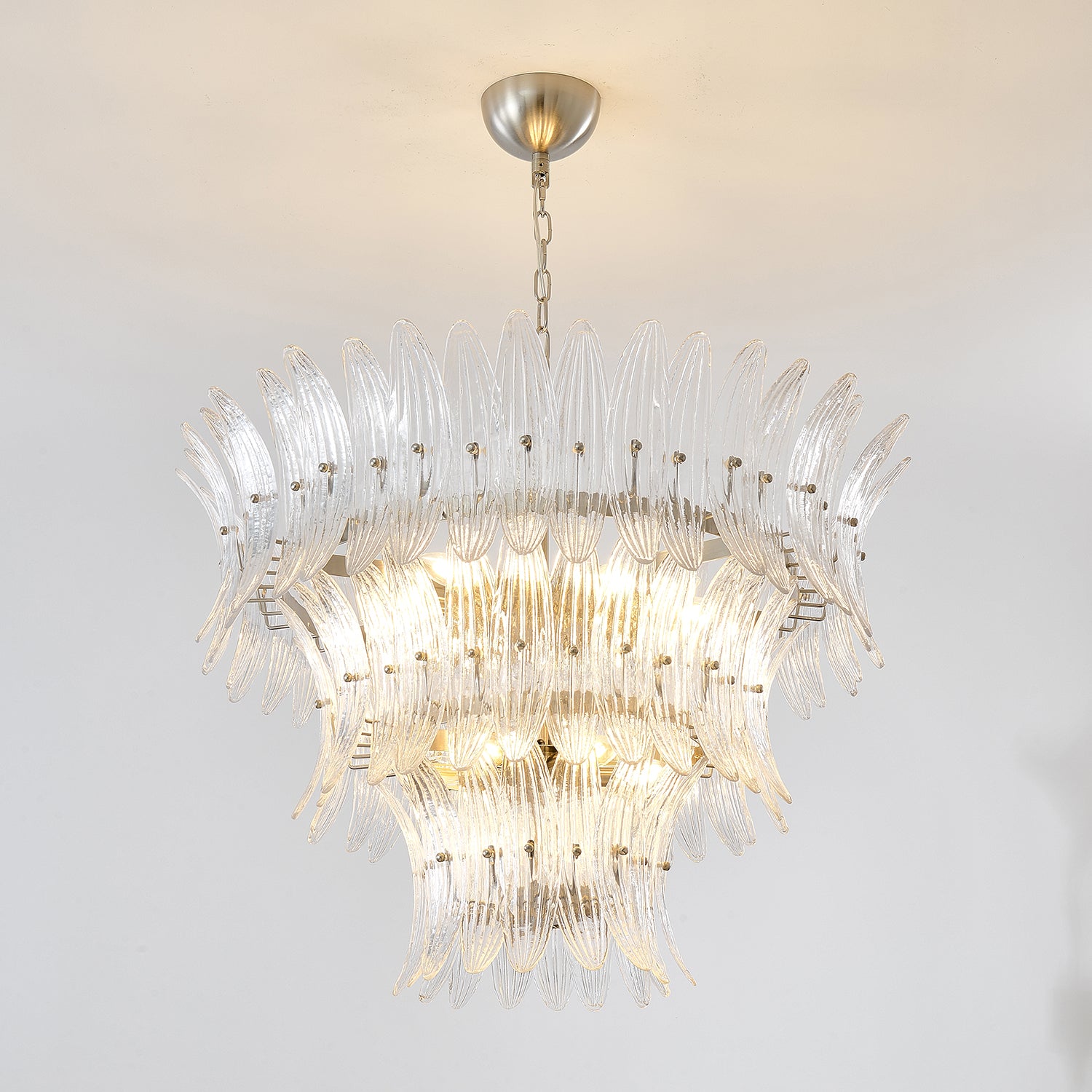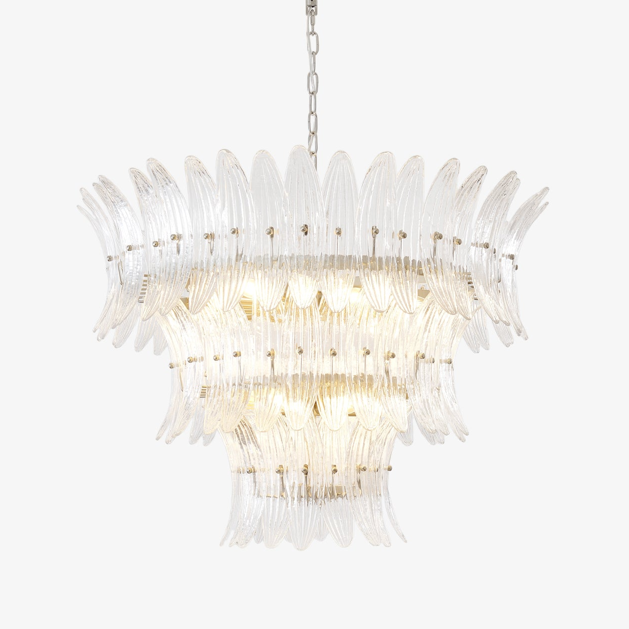 This exquisite piece showcases layers of intricately shaped glass leaves, arranged in a graceful tiered design. Each glass element is carefully handcrafted using traditional Murano techniques, creating a stunning interplay of light and texture. The chandelier’s refined silhouette evokes the natural beauty of palm leaves, while its transparent glass refracts light in a soft, welcoming glow. Finished with sleek metallic accents, this chandelier seamlessly blends modern sophistication with timeless craftsmanship, making it an ideal focal point for any luxurious interior.