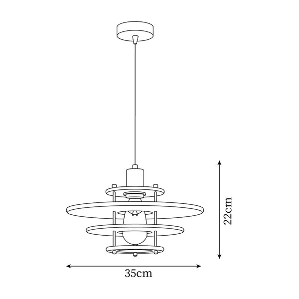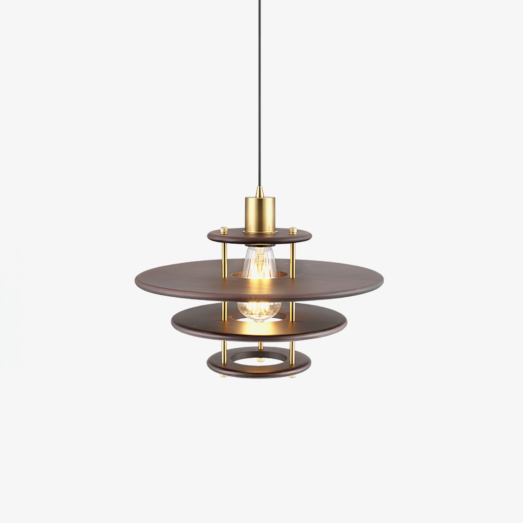 The Pendel Pendant Lamp is a sleek and sophisticated mid-century modern inspired fixture that combines style and function. Featuring a unique design reminiscent of planetary rings, this lamp will become the focal point of any room, casting a warm, ambient light that enhances the atmosphere while providing sufficient illumination. The use of sleek wooden accents and a central golden column adds to its elegant and layered look.