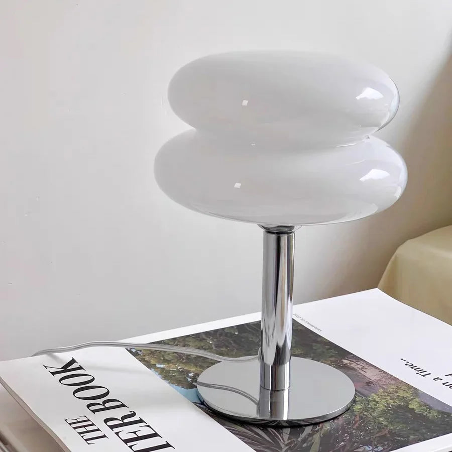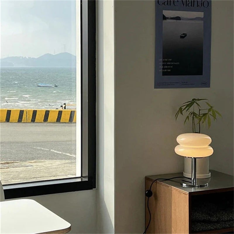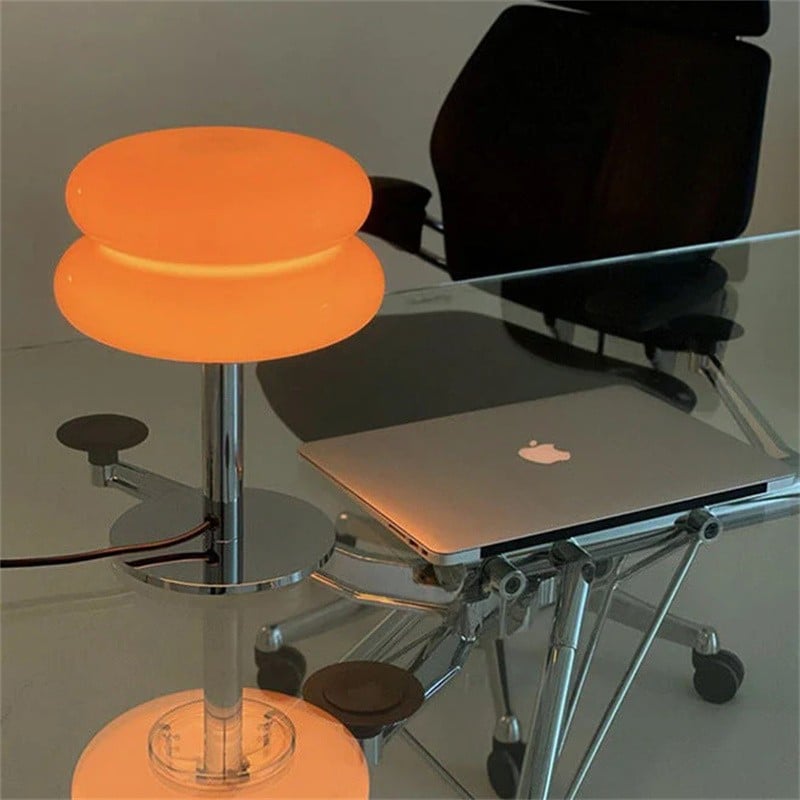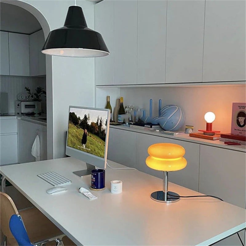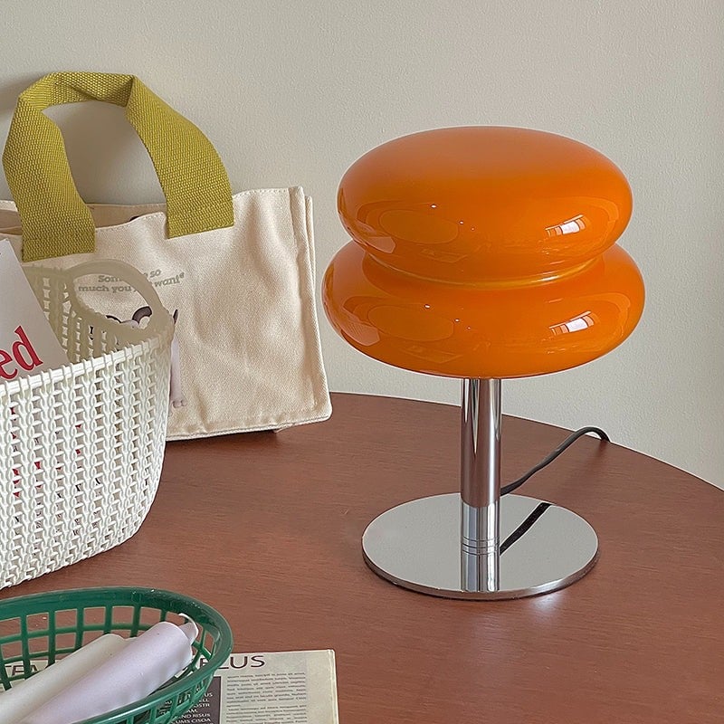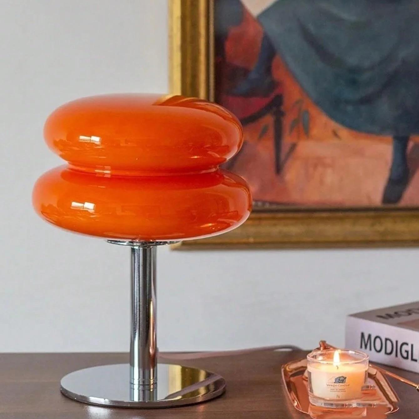 This table lamp is shaped differently and is made from glass and metal. It makes the room feel cozy with gentle light. It looks good in modern or mixed-up rooms, mixing old-fashioned looks with new-style design.