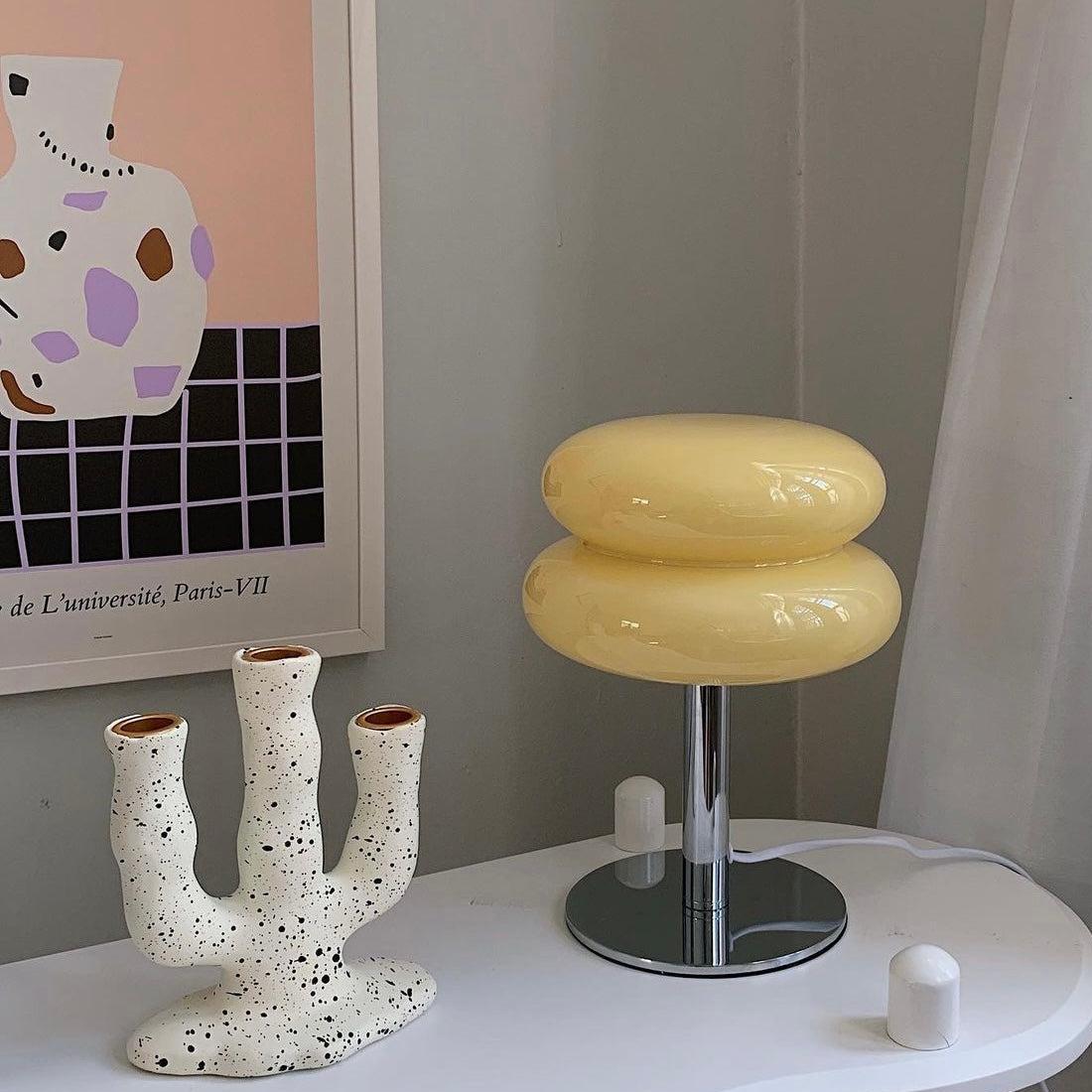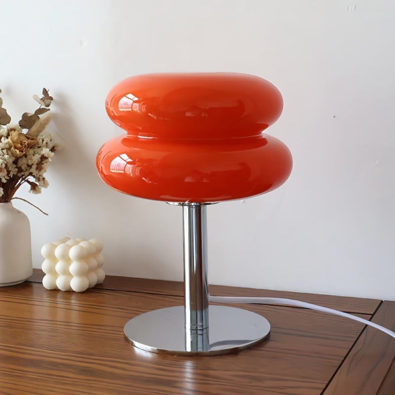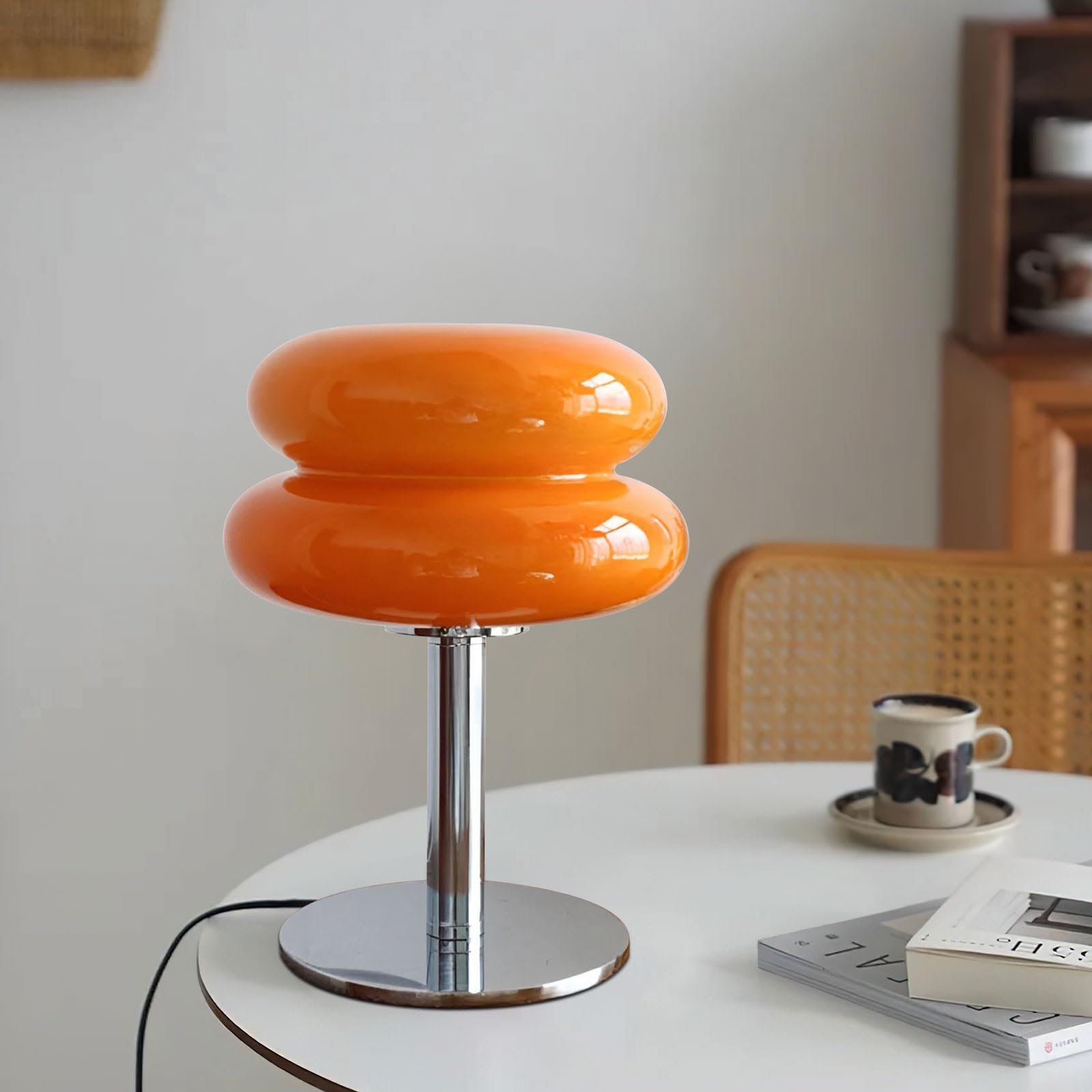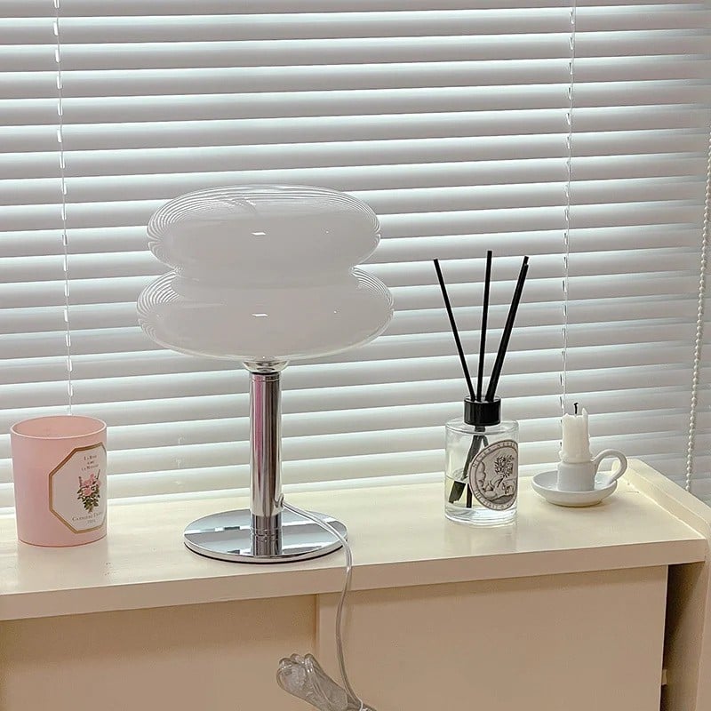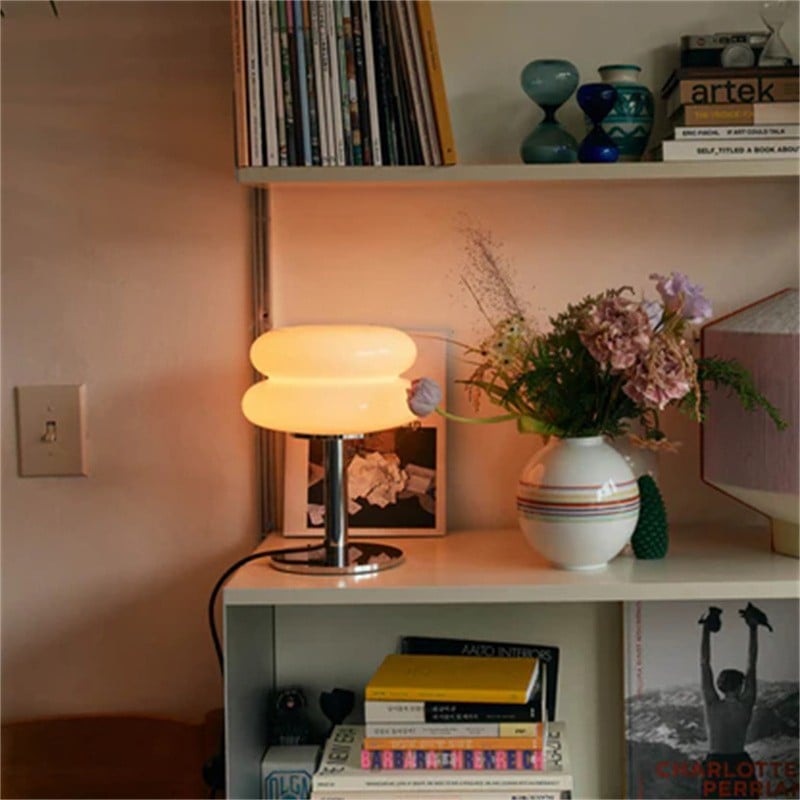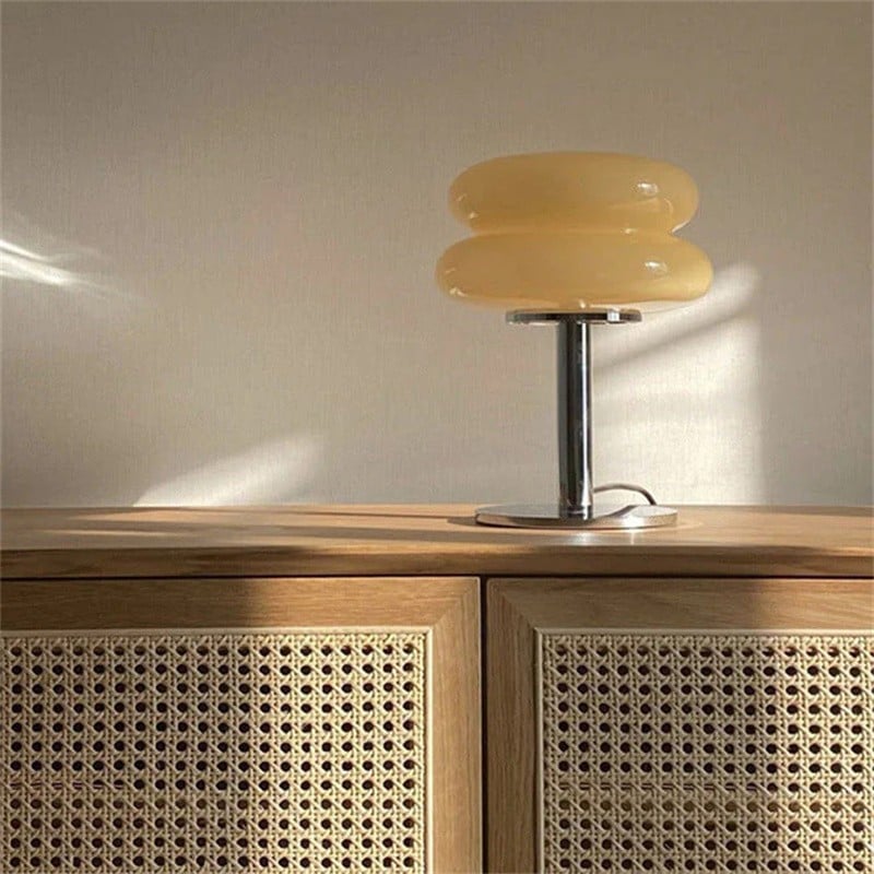 This table lamp is shaped differently and is made from glass and metal. It makes the room feel cozy with gentle light. It looks good in modern or mixed-up rooms, mixing old-fashioned looks with new-style design.