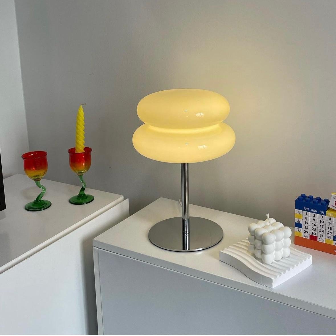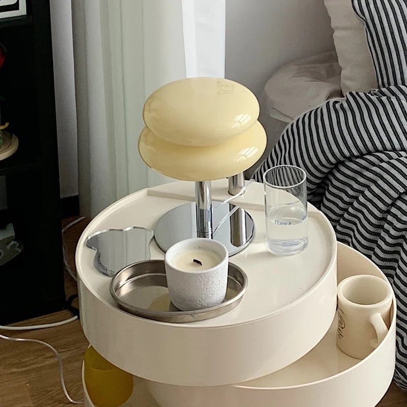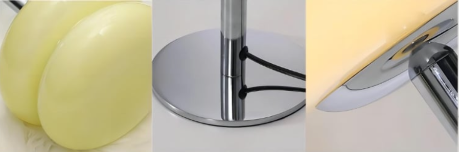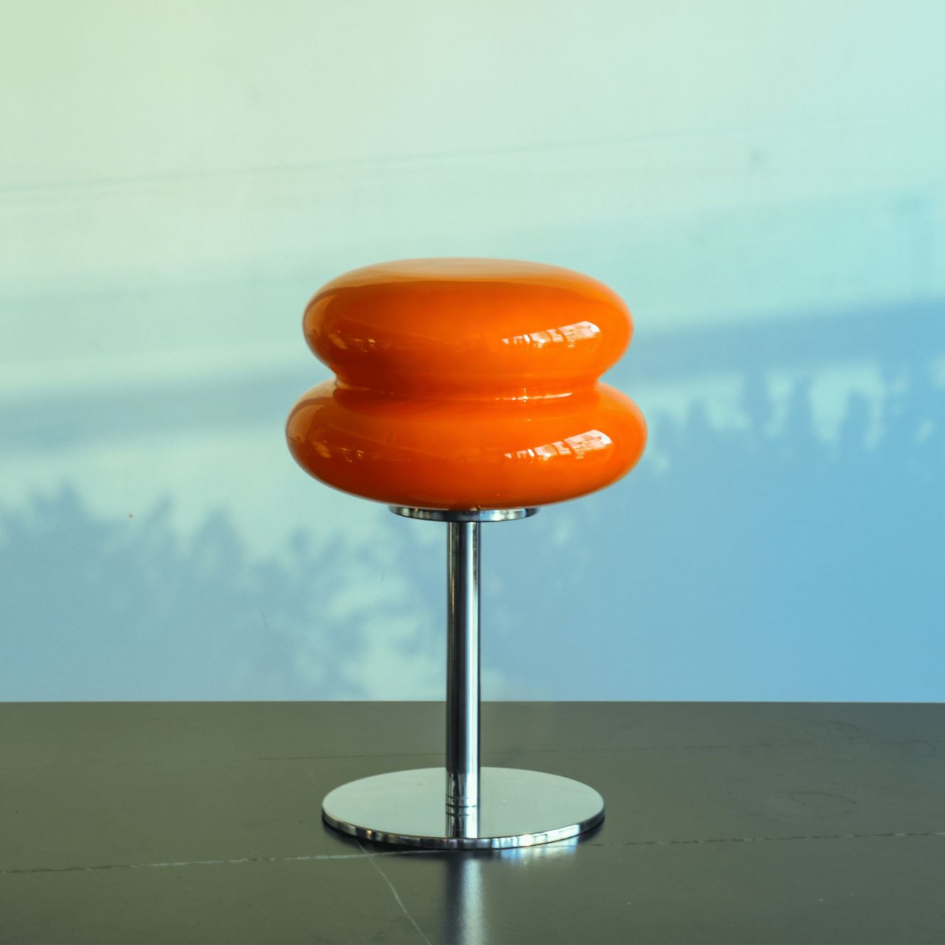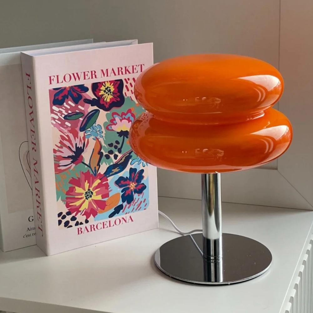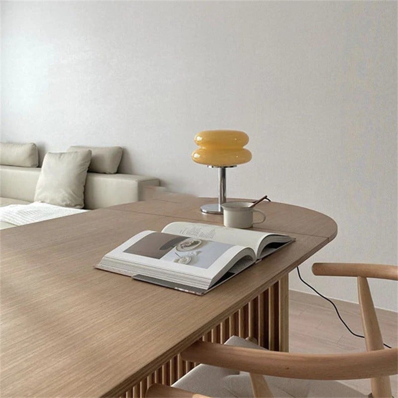 This table lamp is shaped differently and is made from glass and metal. It makes the room feel cozy with gentle light. It looks good in modern or mixed-up rooms, mixing old-fashioned looks with new-style design.
