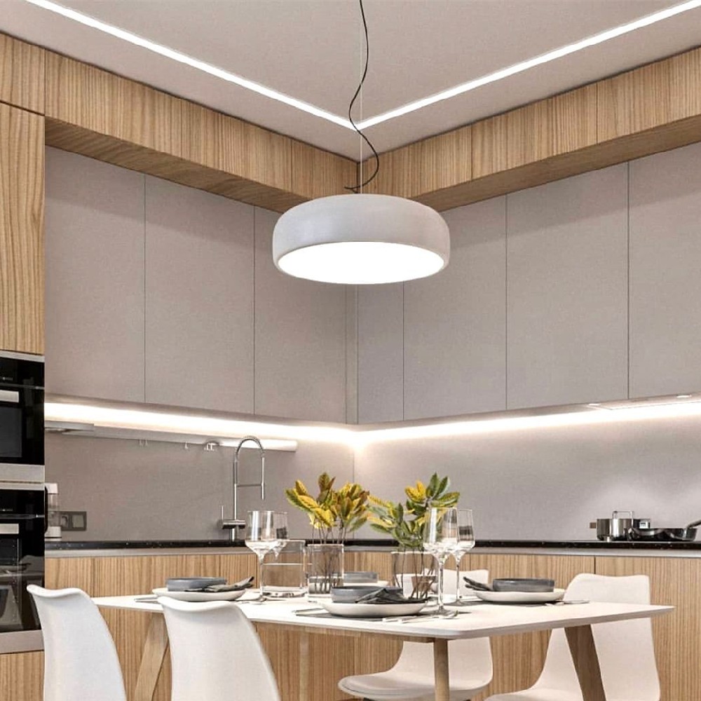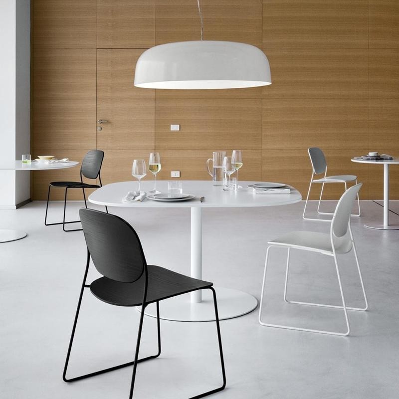 Suspension lamp with direct light. Aluminium body. Available in gloss black, white. Injection-moulded opalescent methacrylate diffuser. Steel ceiling attachment with steel suspension cable. This modern and minimalist design is perfect for a cafe, or home kitchen. It's simplicity adds subtle hints of elegance and class to the culinary setting. These pendant lights are available in black or white, in two sizes. An included frosted disc covers the base of the light.