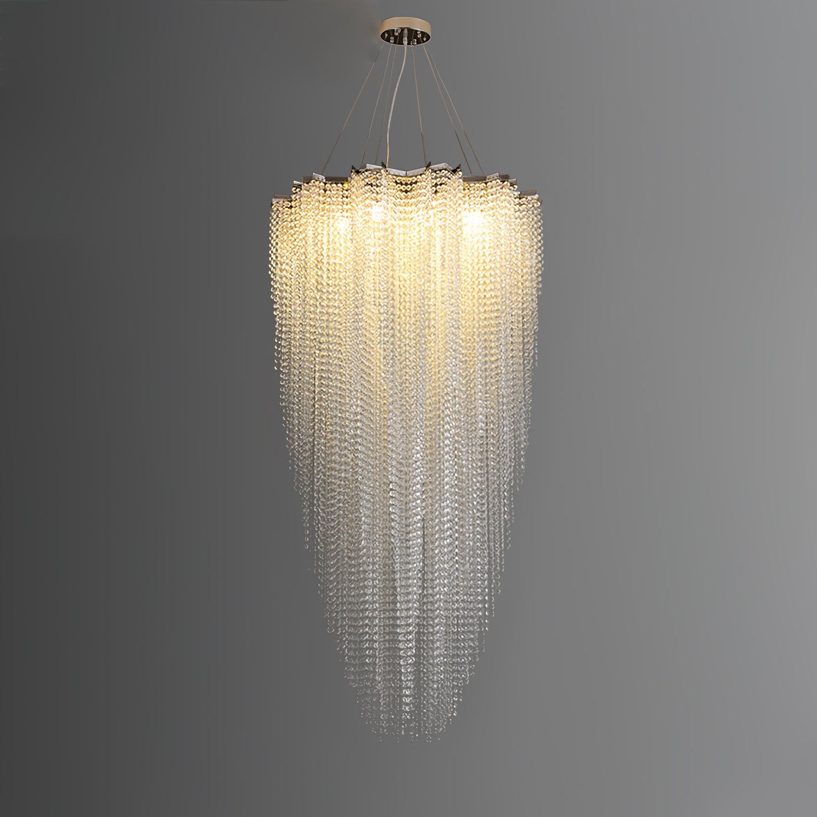 The Stalizi Crystal chandelier features a stunning cascading waterfall of crystal chains, offering a luxurious and dynamic aesthetic. Its cloud-shaped frame adds a touch of elegant curves, while the soft and mesmerizing light creates a dazzling array. Perfect for high-ceilinged areas, from staircases to dining rooms, and commercial spaces.
