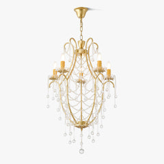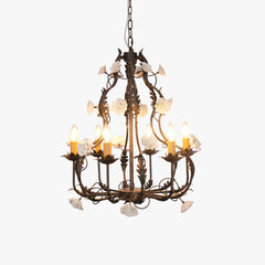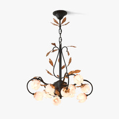 Introducing our exquisite chandelier, a true embodiment of elegance and sophistication. This masterpiece features pristine ceramics white rose blossoms, gracefully positioned amidst shimmering golden leaves that mimic the form of a candelabra. Each branch is punctuated with sparkling crystal buds, which catch and reflect light in the most enchanting manner. The gold-tone structure not only provides a sturdy foundation but also enriches the aesthetic, imparting a regal ambiance. Whether it's to elevate your living space or add a touch of opulence to a grand hall, this chandelier promises to be a captivating focal point.