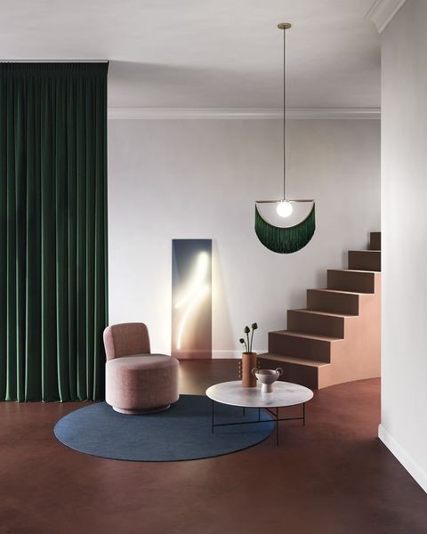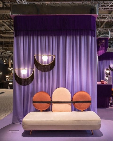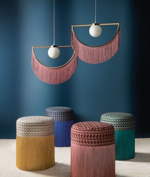 A post-modern inspiration for this glamour and retro pendant. A nod to the past and the present, Wink symbolises an inverted eye. Decorated with colourful fabric fringes, this sophisticated and bohemian pendant revisits the boudoir theme and 30s style with a great deal of modernity. Such a precious jewel, the fringes elegantly adorn the golden metal geometric structure. The rigidity of the rainbow serves as a contradiction to the fragility and delicateness of the fringes. This silky and light curtain gently twirls under the effect of the air currents... Wink draws both the eye and the hand: you want to caress and run your hands through it, slipping them inside this waterfall of wools that are warm to the touch. The bulb is housed in a delicate white glass globe.